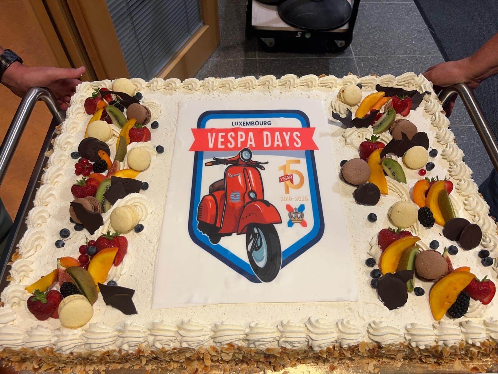 After lunch, the Vespisti divided into groups of 10 to 15 and, after parking their scooters, set off on a guided tour of Luxembourg City centre. Every street corner, building, and square was described in detail, complete with engaging storis. They were fortunate enough to witness the Changing of the Guard outside the Grand Ducal Palace, an event that takes place only three times a year. After around an hour and a half, everyone met up again at the starting point to collect their Vespas and ride back at their own pace to the Multipurpose Centre for the gala dinner. The meal had a distinctly Italian flavour, with chefs and staff serving up delights from the Bel Paese that wowed the guests. The birthday cake marking the 15th anniversary of the Vespa Club Luxembourg was, of course, a highlight of the evening.
