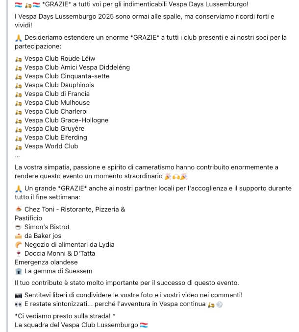 SOCIAL CORNER – THE ‘THANK YOU’ FROM VESPA CLUB LUXEMBOURG, FACEBOOK::