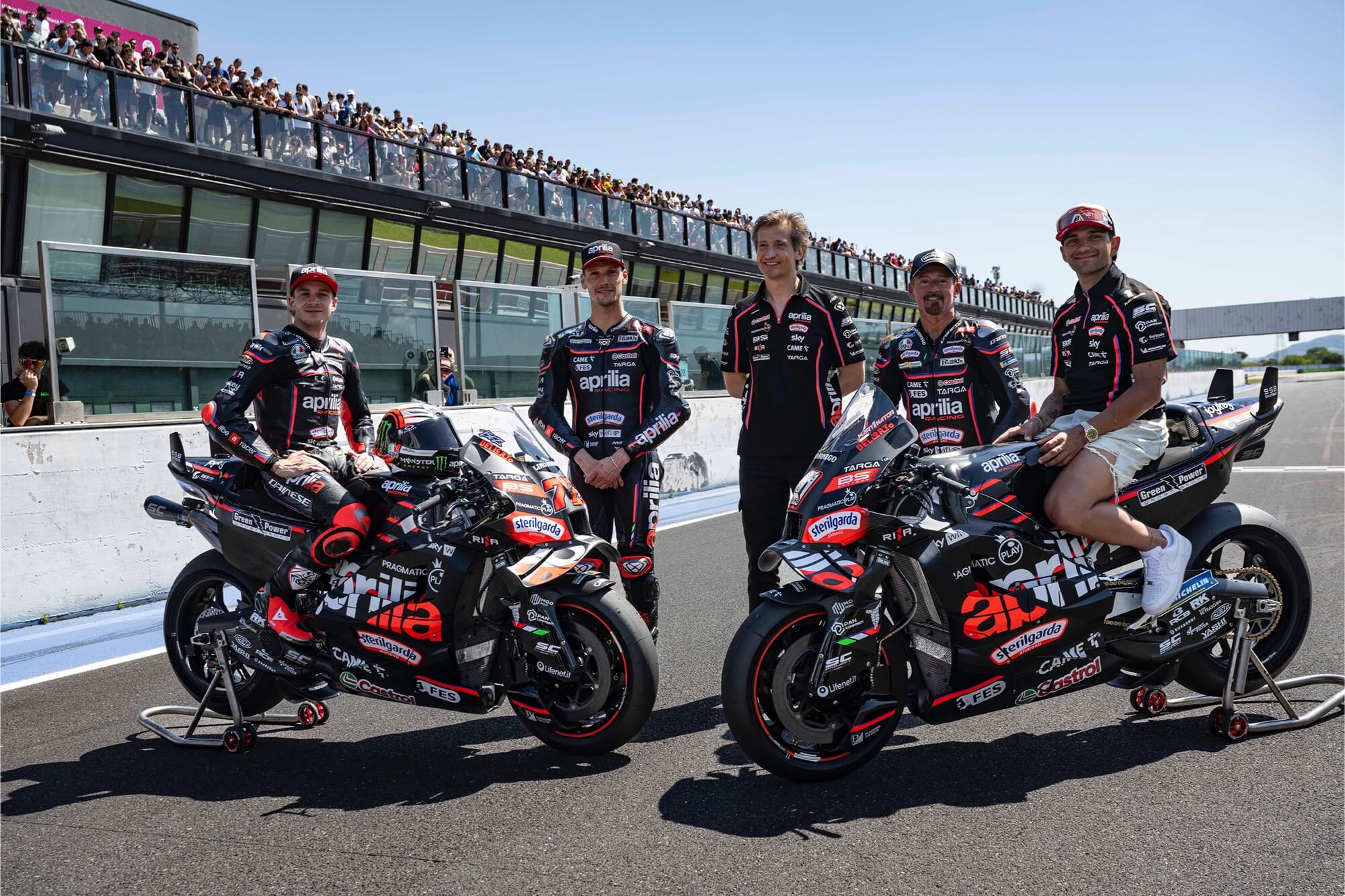 TRIUMPH OF CROWD AND PASSION FOR MARCO BEZZECCHI, WINNER AT RECENT GP IN SILVERSTONE, AS WELL AS FOR WORLD CHAMPION JORGE MARTIN, LORENZO SAVADORI AND TRACKHOUSE RIDER RAUL FERNANDEZ. STARS MAX BIAGGI AND LORIS CAPIROSSI PUT ON A SHOW ON THE TRACK WITH THE RS-GP AND THE LEGENDARY 2-STROKE MOTORCYCLES, WHILE BEZZECCHI AND CORRADINI WERE VICTORIOUS IN THE RACE OF STARS