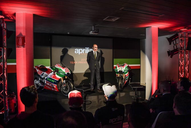 FROM LEFT: THE NEW BIKE APRILIA RS-GP 2017, ROBERTO COLANINNO, SAM LOWES, LORENZO SAVADORI (WSBK), ALEIX ESPARGARÒ.