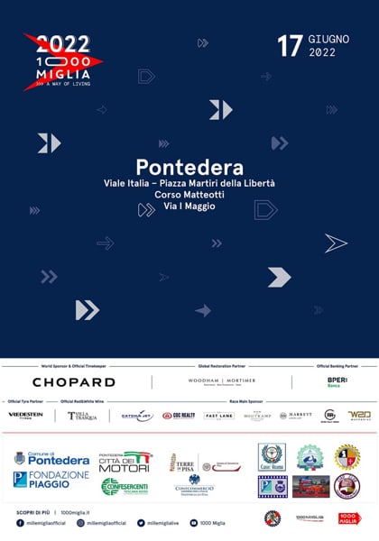 OPEN FROM 14 JUNE THROUGH 8 OCTOBER 2022. IT IS A TRIBUTE TO THE PASSING OF THE MILLE MIGLIA IN PONTEDERA FOR THE FIRST TIME EVER. AND THE CITY COMES TO LIFE WITH EVENTS, WITH “THE NIGHT OF MOTORS”.