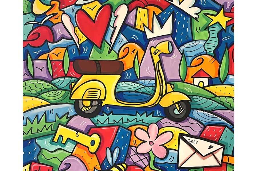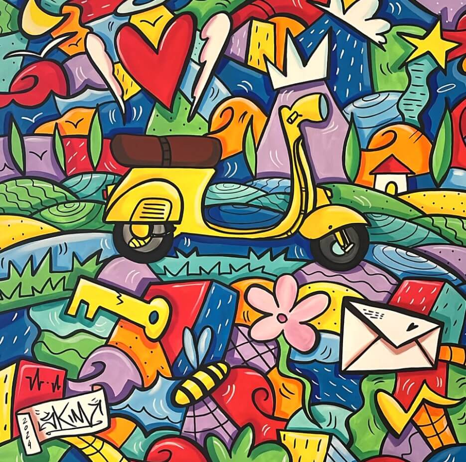 February 2025 (G.T.) – A technicolour journey into the “Harmonic Chaos” of the Italian artist Skim: this is the premise of his solo exhibition, which is set to open on the 1st of March and run until the 5th of April 2025, at the Piaggio Museum in Pontedera (Pisa province, Tuscany, Italy). “Dolcevita” is the title of his exhibition, curated by Riccardo Ferrucci and with the coordination of Filippo Lotti, produced by Casa d’Arte San Lorenzo and supported by FuoriLuogo – servizi per l’arte.