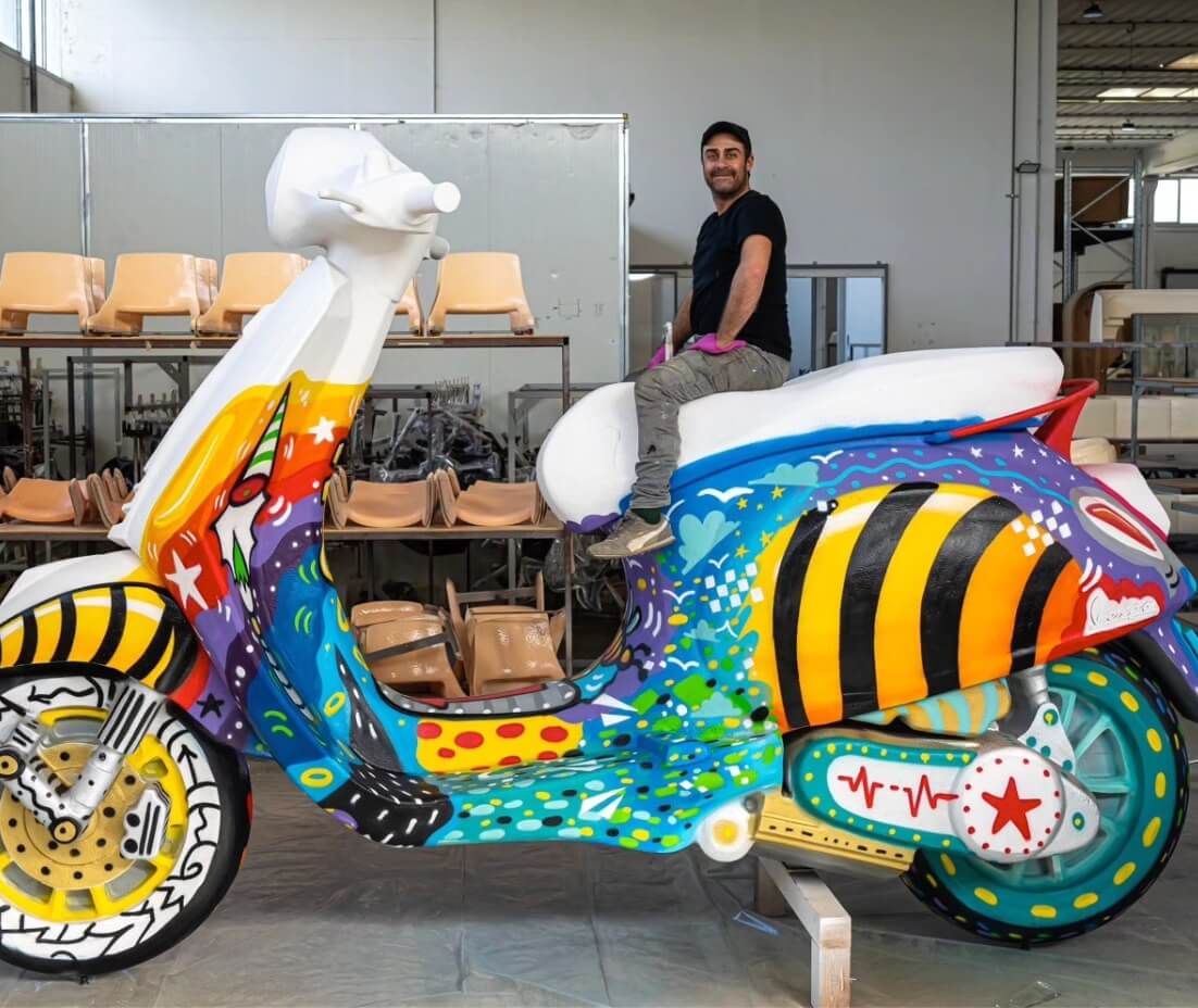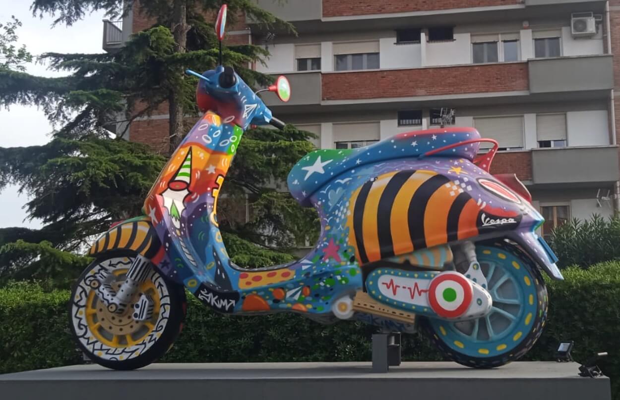 For this initiative, sponsored by the Piaggio Foundation, the Municipality of Pontedera, the Region of Tuscany and the Pontedera Cultural Foundation, the works of the artist will be exhibited alongside a series of original works that pay homage to Piaggio’s iconic vehicles, from the Vespa to the Ape and the Ciao.