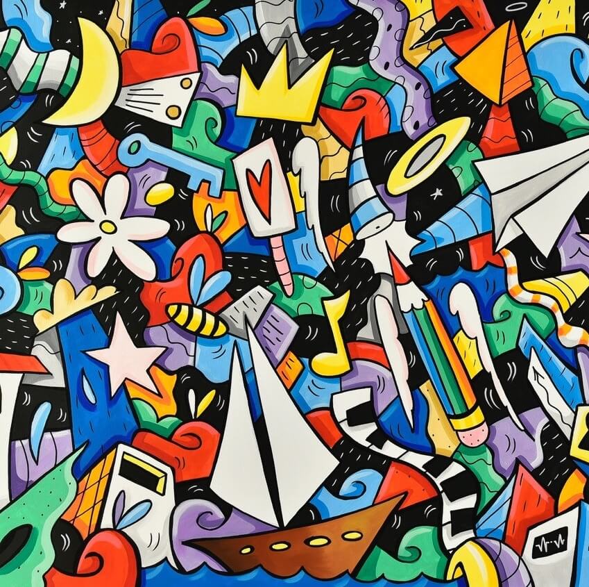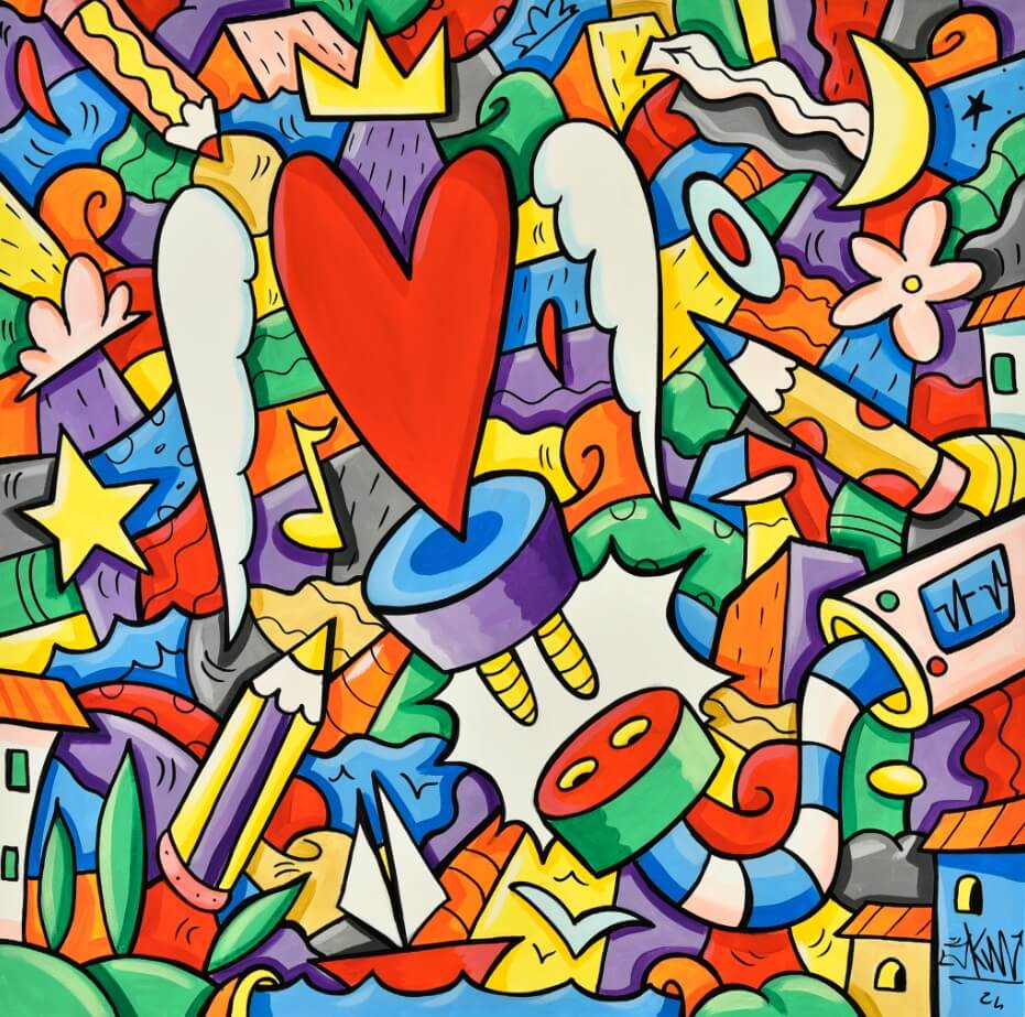 The works by Skim, characterised by his distinctive “Harmonic Chaos”, reflect his quest as an artist, and narrate stories and dreams, analysing the everyday and translating it into artistic forms that surprise with their contrasts between explosions of colour and the profound messages that they convey: composed of a collection of different elements, they come together in a harmonious way, exploring themes that are also able to mirror the personal experiences of each spectator.