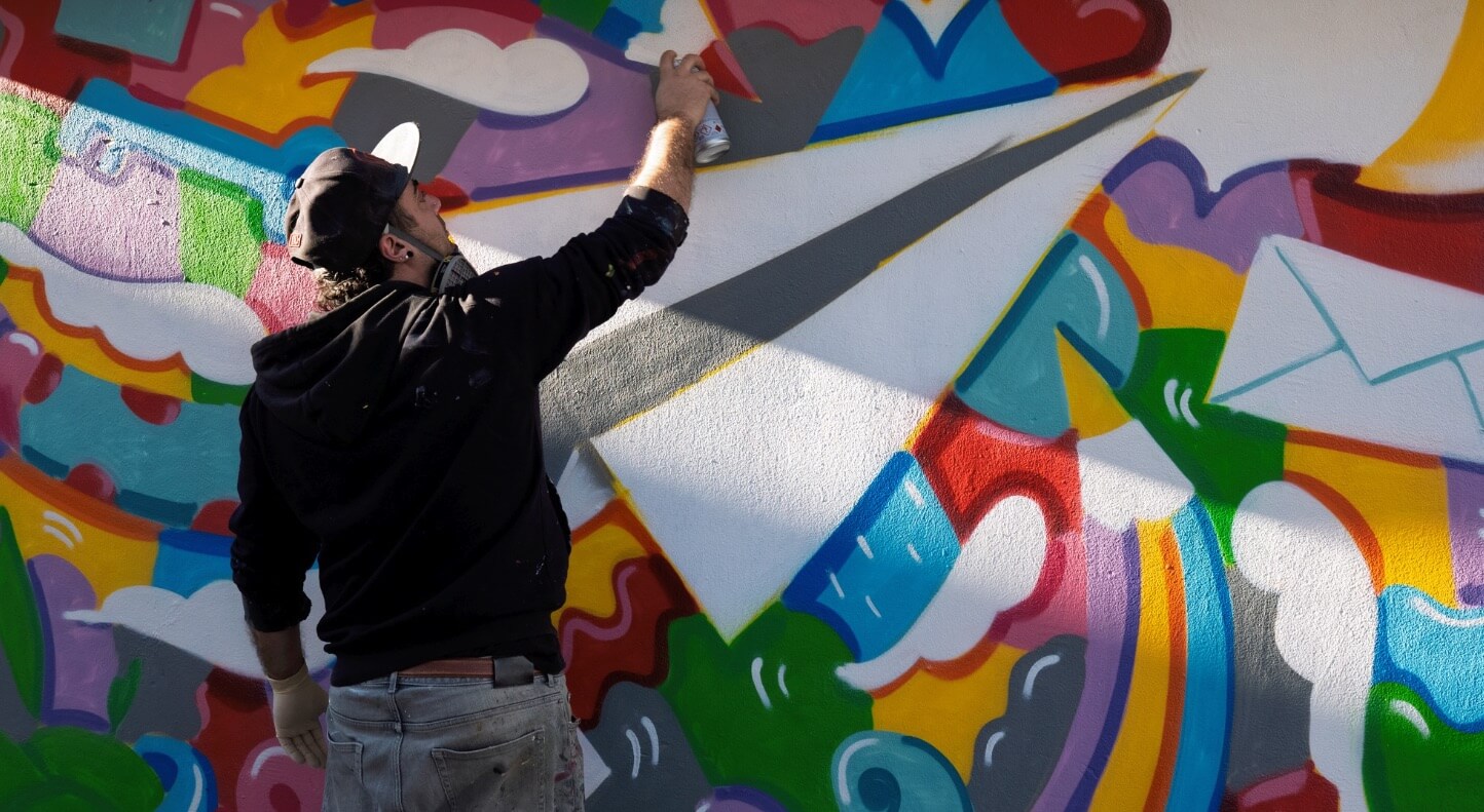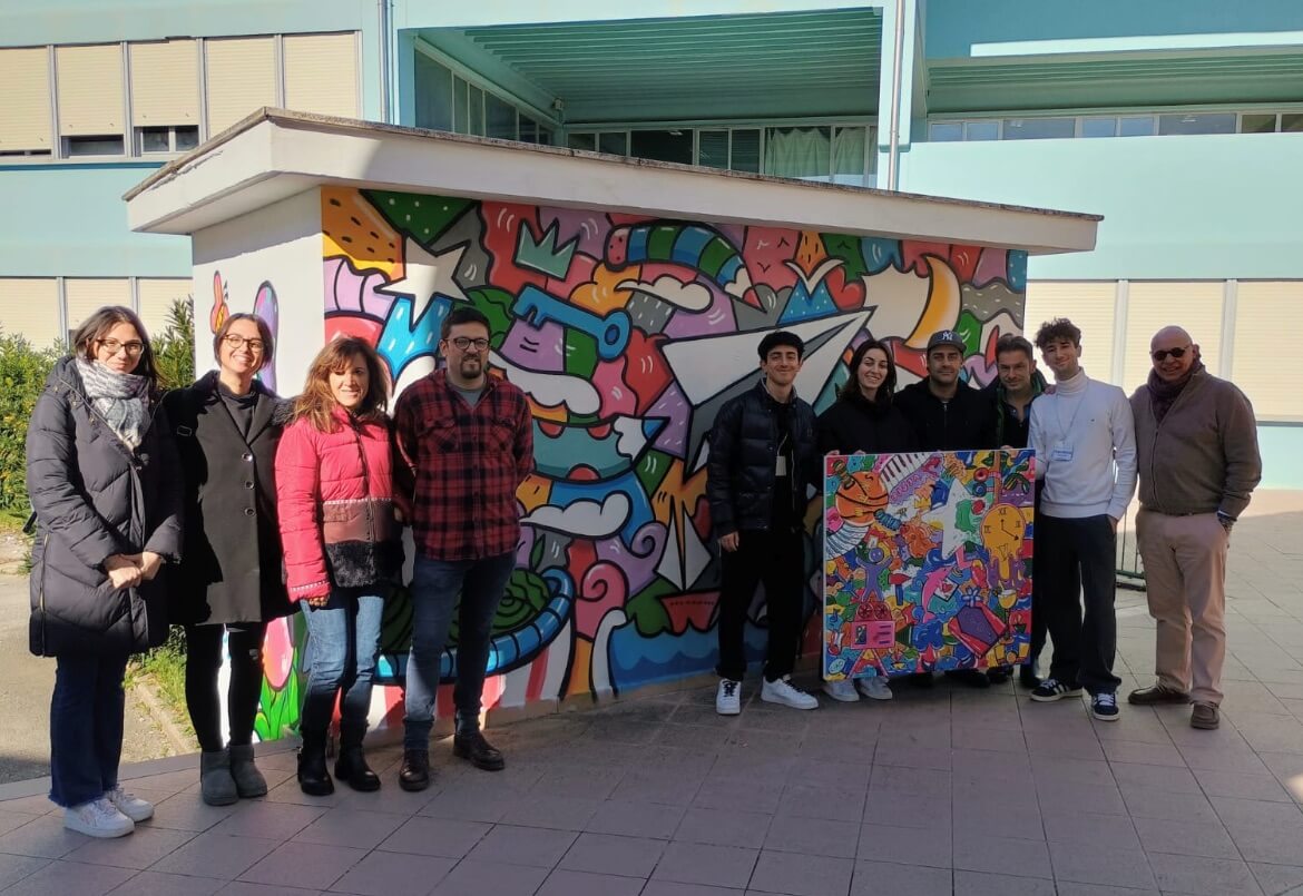 For the exhibition, the Municipality of Pontedera has created an artistic experience shared with the Liceo XXV Aprile high school: in collaboration with the students, Skim held an educational workshop and created a large canvas (‘Supercinema Fantasia’) in his iconic style, which will be unveiled at the Piaggio Museum during the exhibition period. In addition, the artist created a work on one of the walls of the school, transforming the space into a mural that expresses the power of art as a tool for redevelopment and hope. ‘Awareness and Freedom’ was the theme suggested by the students.