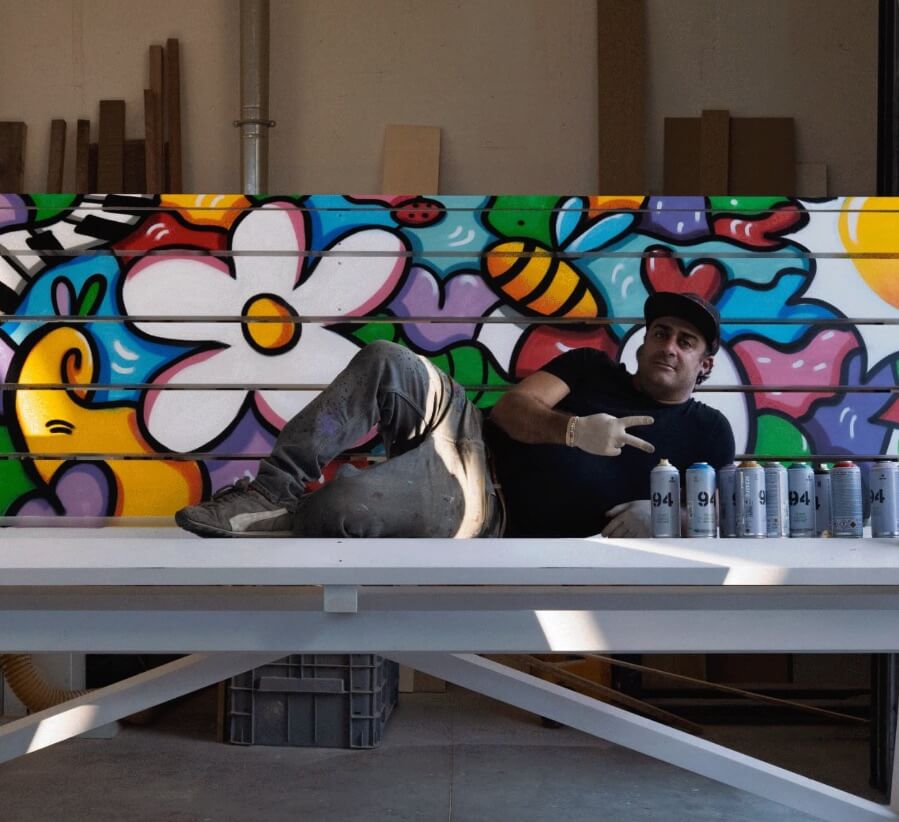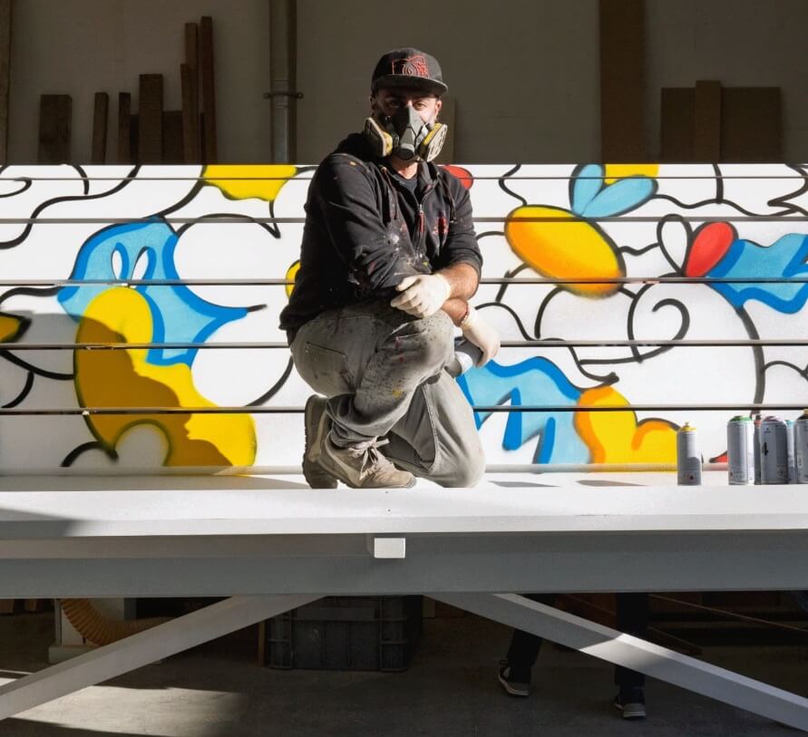 The artist works on the ‘Panchina Skimmata Gigante’. Source: https://www.facebook.com/skimworld/?locale=it_IT