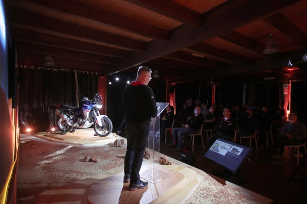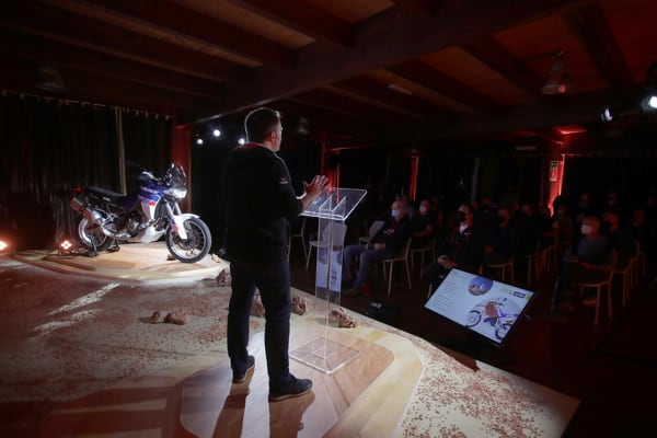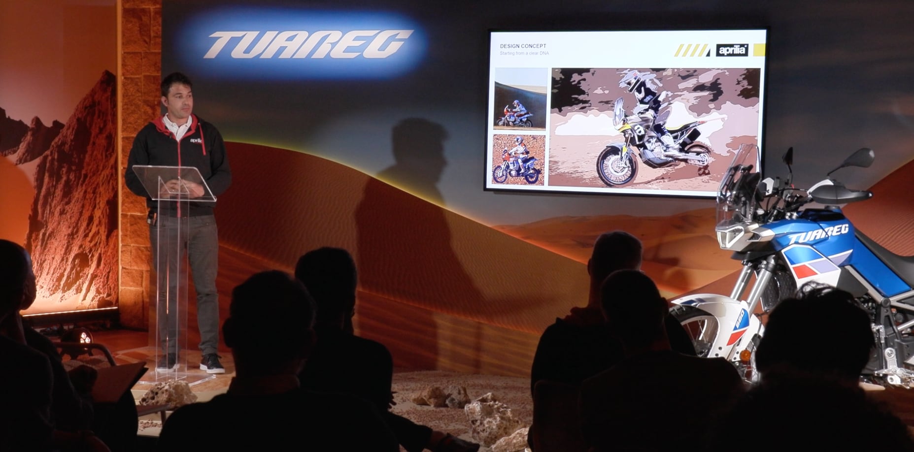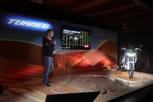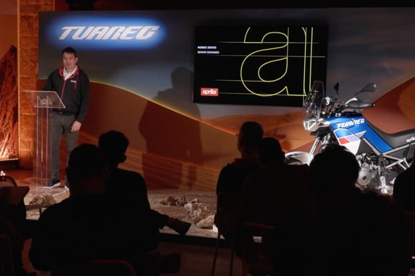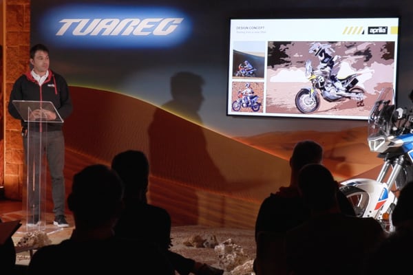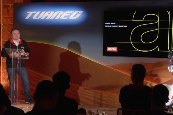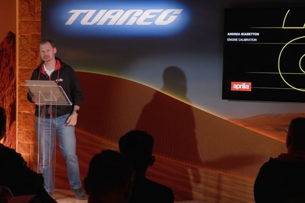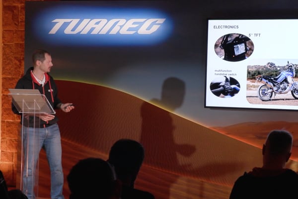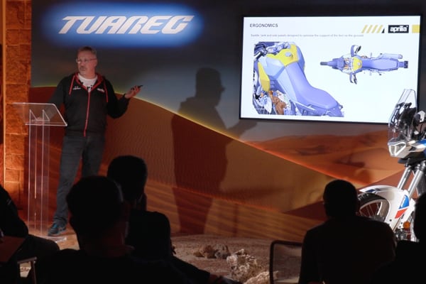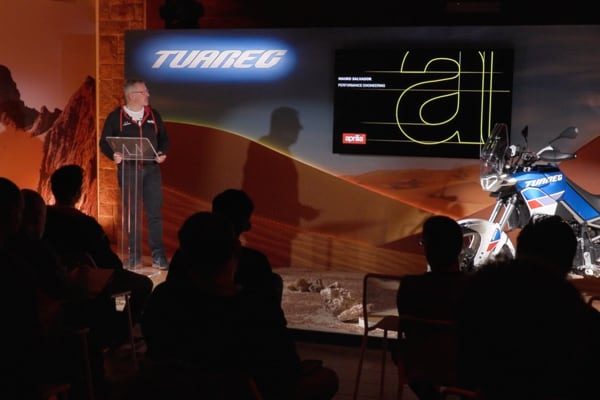 The team Aprilia speakers provided a broad overview (from product marketing to design, from engine to electronics), interspersing thrilling videos throughout the presentations with the Tuareg 660 “put through its paces” in the most diverse riding conditions.
