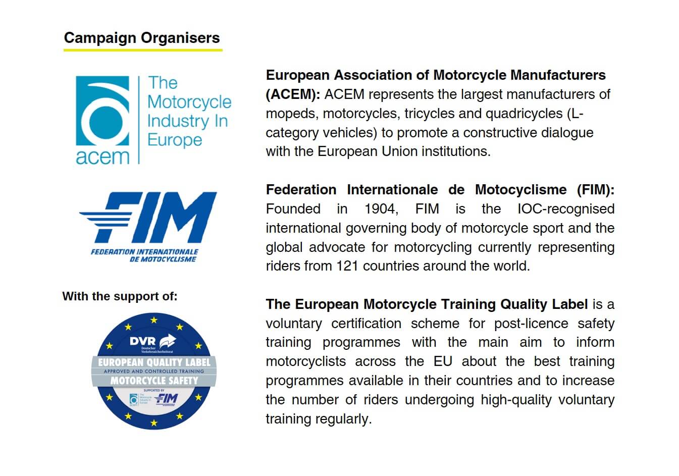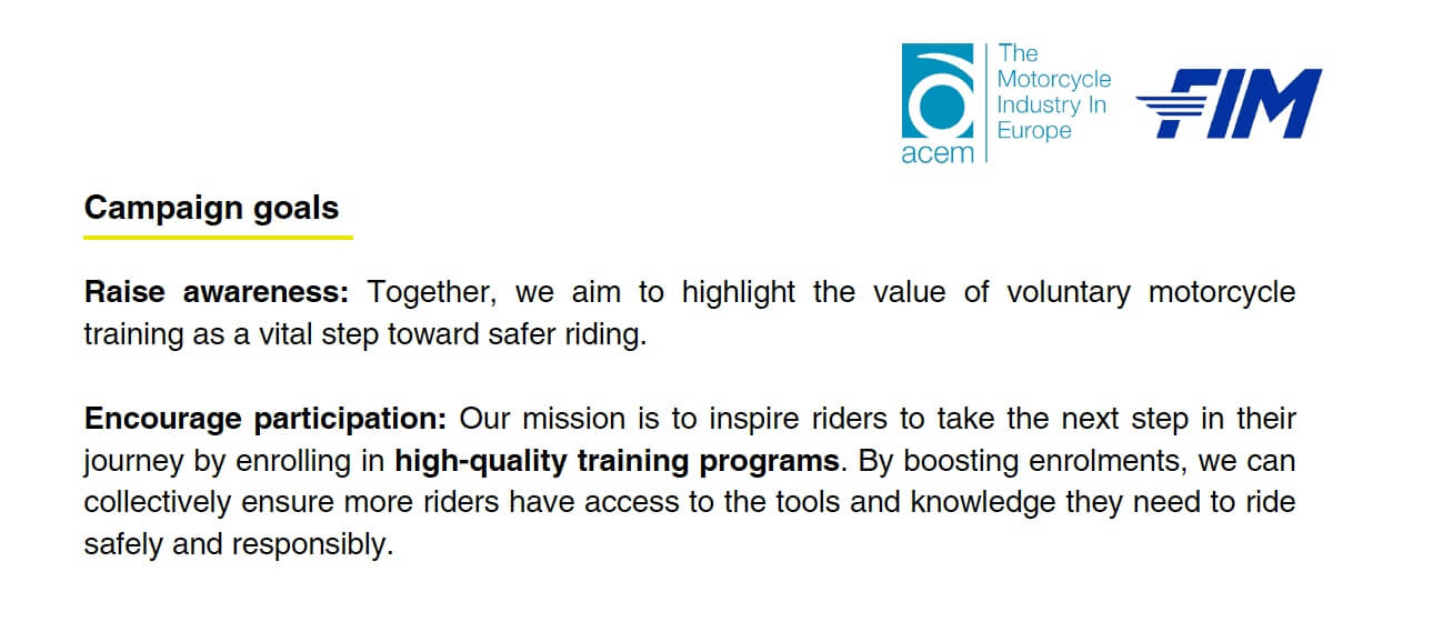 QUOTES. Antonio Perlot, ACEM Secretary General, said: “The European Motorcycle Training Quality Label is a key pillar of the motorcycle industry’s safety strategy. Voluntary training provides motorcyclists with the opportunity to further improve their skills, enhance their traffic awareness and develop strategic riding attitudes. ACEM is confident that this campaign will make Europe’s roads safer for riders, contributing significantly towards EU safety targets and building an inclusive road safety culture, benefiting all.”