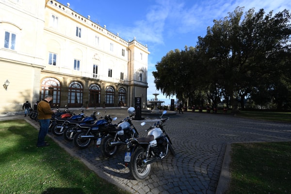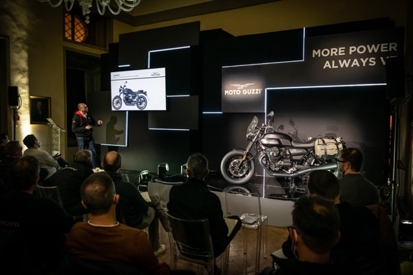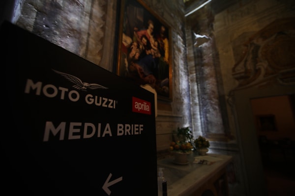 During the week of the press launch, the event organisation anticipated a stream of staggered arrivals and departures for groups of journalists. The work schedule was always the same: double media brief, held in a historic hall, with thrilling introductory official videos (editor's note: available on the home page and in the Best Videos section) dedicated to the new models, and decked out bikes displayed on “rotating” stages, unveiling first the Moto Guzzi V7 and then the Tuono 660.