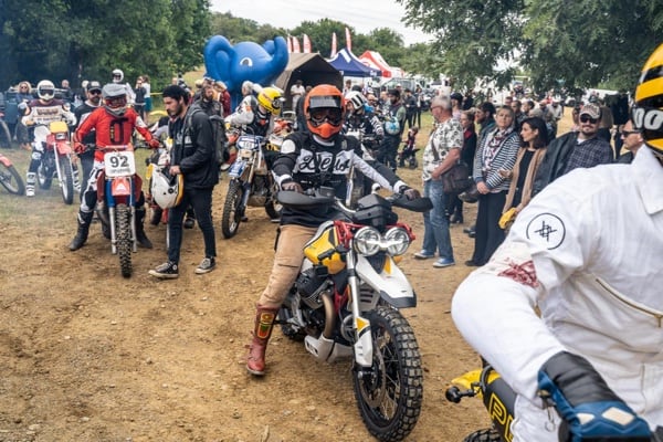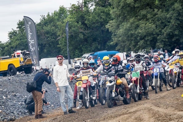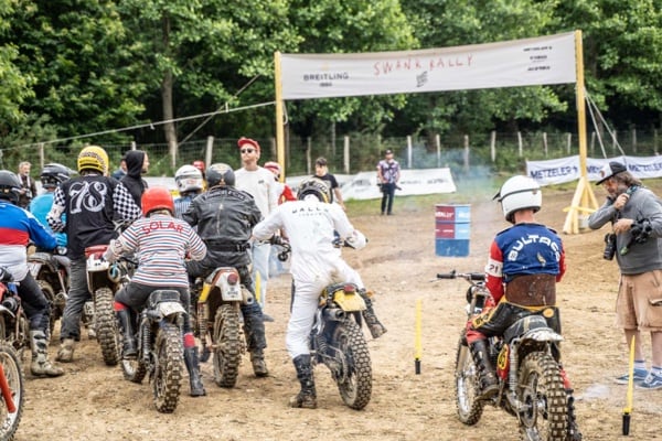 Fabien at the start of the Deus Swank Rally; under the title, he and his muddy bike at the end of the timed race.