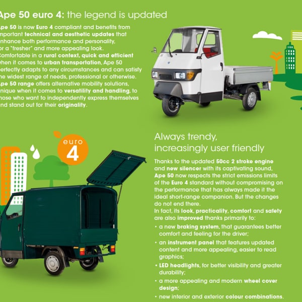 Ape 50 outfitted for urban clean-up services: with its unique features, Ape 50 is the ideal solution for urban clean-up operations, thanks to its outstanding agility and compact dimensions, which make it the perfect vehicle in congested city traffic, small centres and historic hamlets.