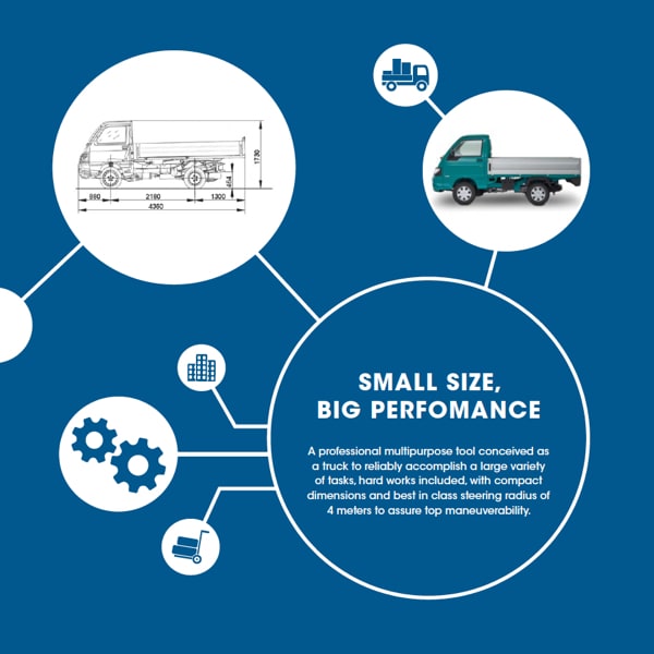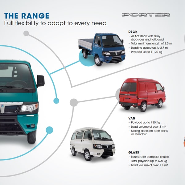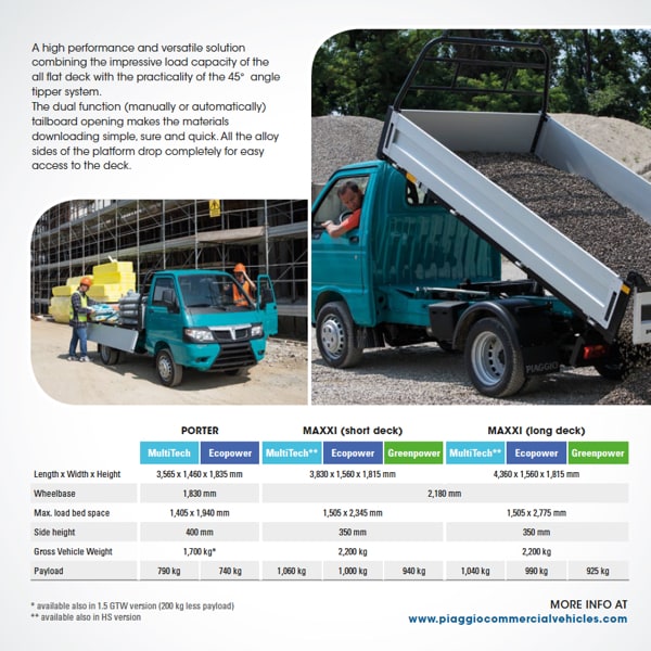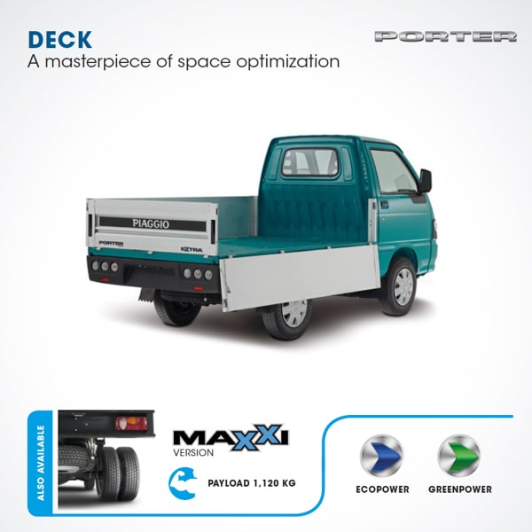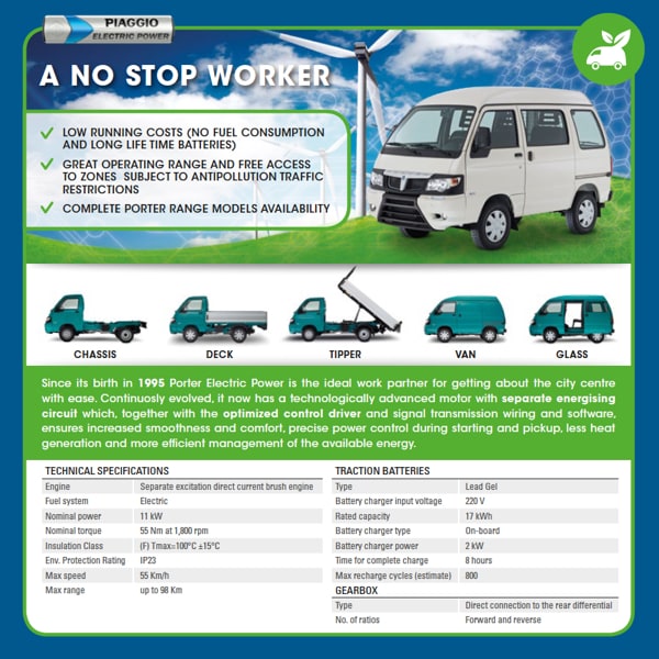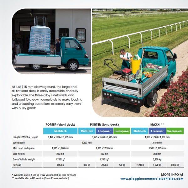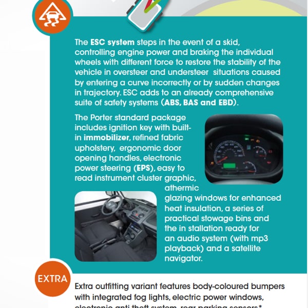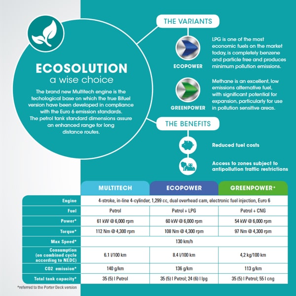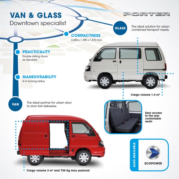 Plus, thanks to the two Bifuel versions (petrol+LPG, petrol+CNG), Porter guarantees working continuity for all those companies that operate in the urban environment, characterised by increasingly stricter anti-pollution restrictions.