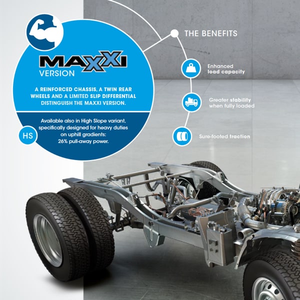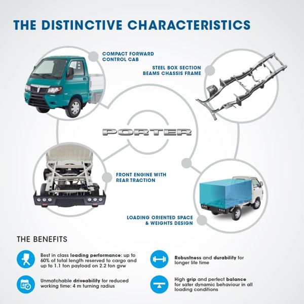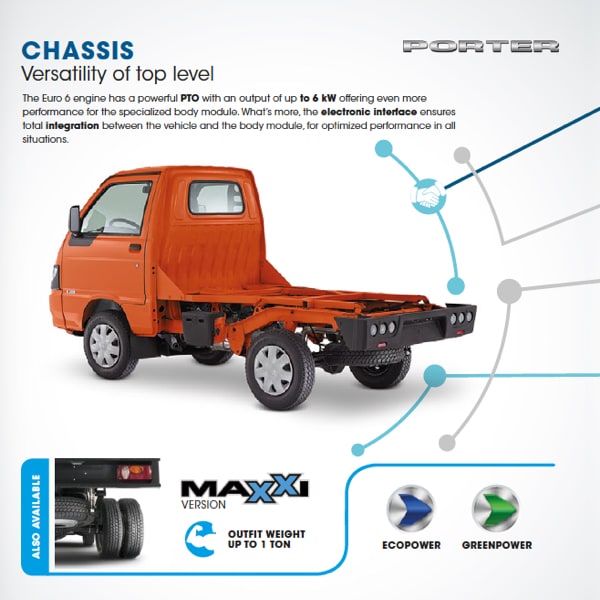 Porter Maxxi Chassis GPL: Porter Chassis is the solid base on which to install multiple transformations capable of meeting the specific needs of the widest range of sectors. Its compact size, combined with its record cargo capacity, takes performance of the equipment packages to the top, streamlining everyday public works and construction operations and enhancing on the road sales activities.