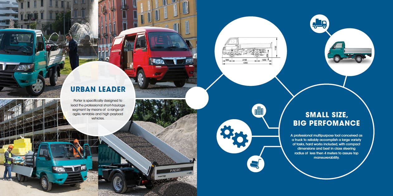 PIAGGIO PORTER, A GREAT RANGE! The Porter 2016 range is equipped with eco-friendly high-performance engines as well as new safety and comfort features – ABS and ESC stability control are standard on all the models – and with an outstanding versatility in the fittings, to guarantee a wide choice of configurations to meet every transportation need. The MultiTech petrol engine on the Porter and Porter Maxxi is a brand new unit.