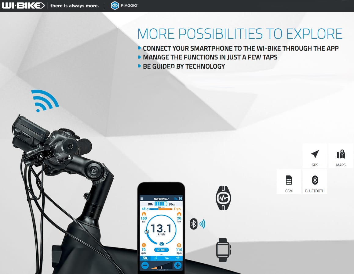 Thanks to the PMP (Piaggio Multimedia Platform) technology, the smartphone connects via bluetooth to Wi-Bike to monitor, using the App, training data and set targets in terms of heart rate or calorie consumption. But Wi-Bike also means community: at the end of each itinerary, you can share the data related to your latest experience with your friends, on the most popular social networks.