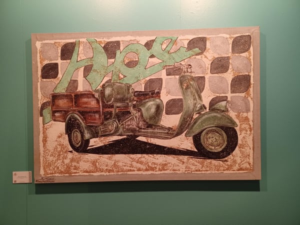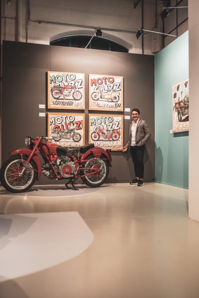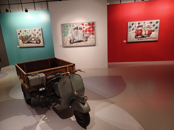 A history to which Stefano Berardino also dedicates a tribute on the canvases dedicated to other Piaggio products, such as the runabout manufactured in France in the ’50s (the Vespa 400) and the beloved Ape three-wheeler (born in ’48 out of a Vespa “rib”), not to mention the motorcycling sector, with four works dedicated to the long history of Moto Guzzi, which recently celebrated 100 years of highly successful operations.