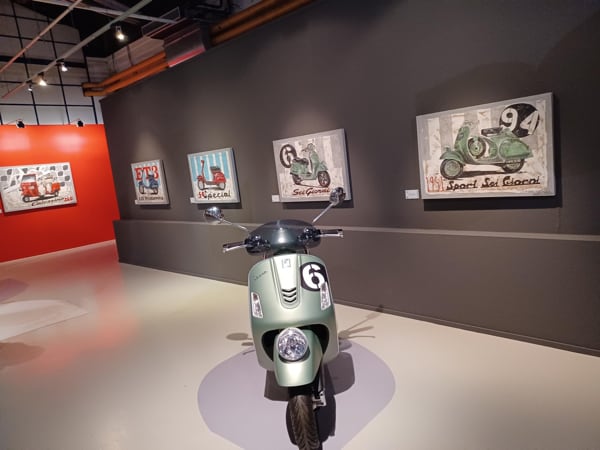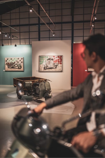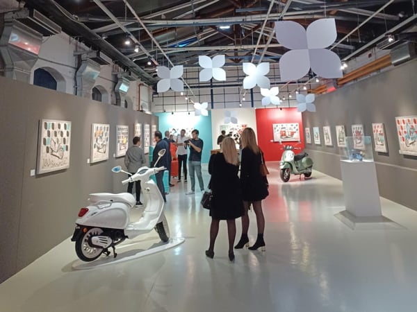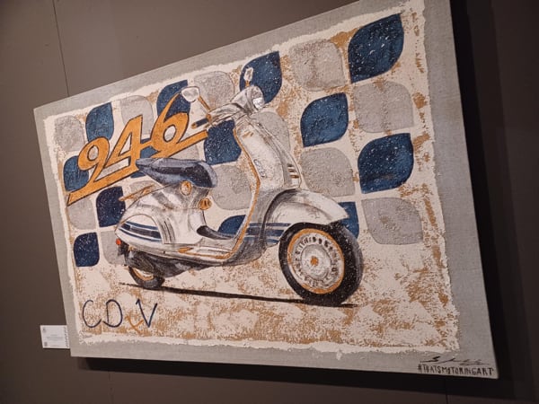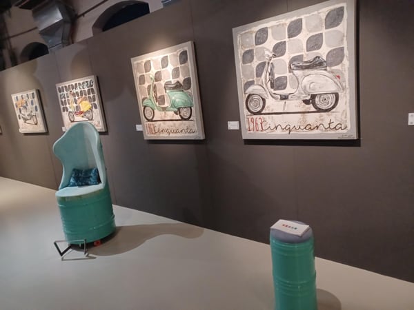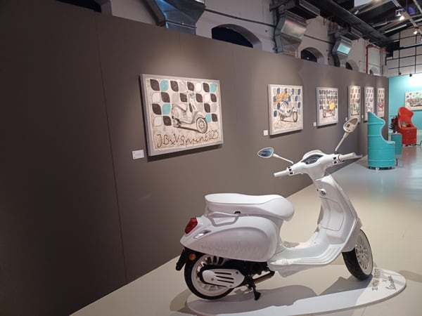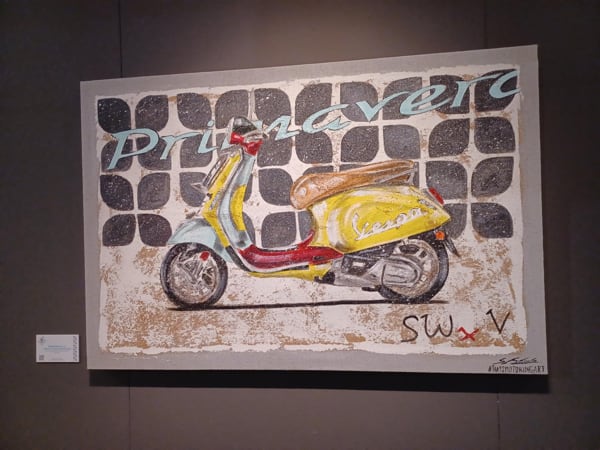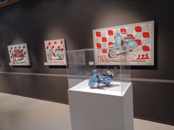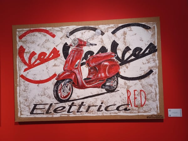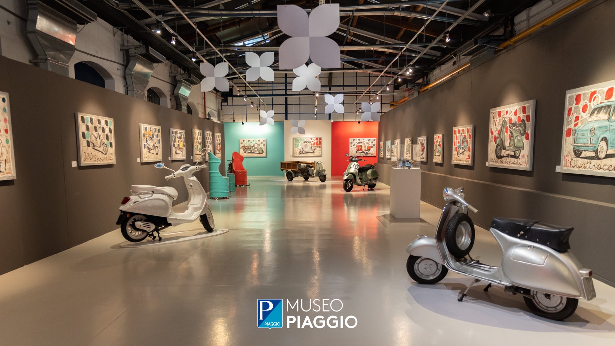The paintings, all large in size, tell the story of Vespa in a true “parade”: from the elegant models of the fifties and sixties all the way to its more modern versions. All in the setting of a harmonic and engaging layout which is perfectly placed in the halls of the Piaggio Museum’s temporary exhibits, in the heart of the old Piaggio workshops, “in dialogue” with the unique models displayed in this true “temple” of the history of mobility and Italian style.