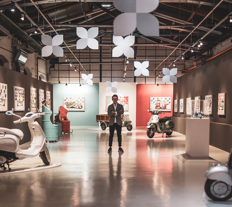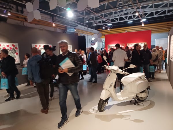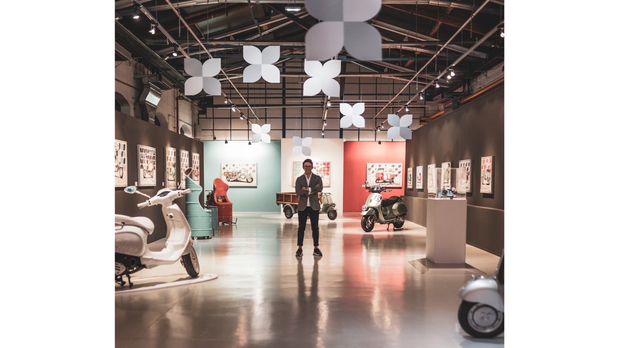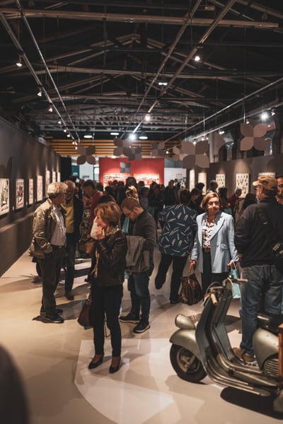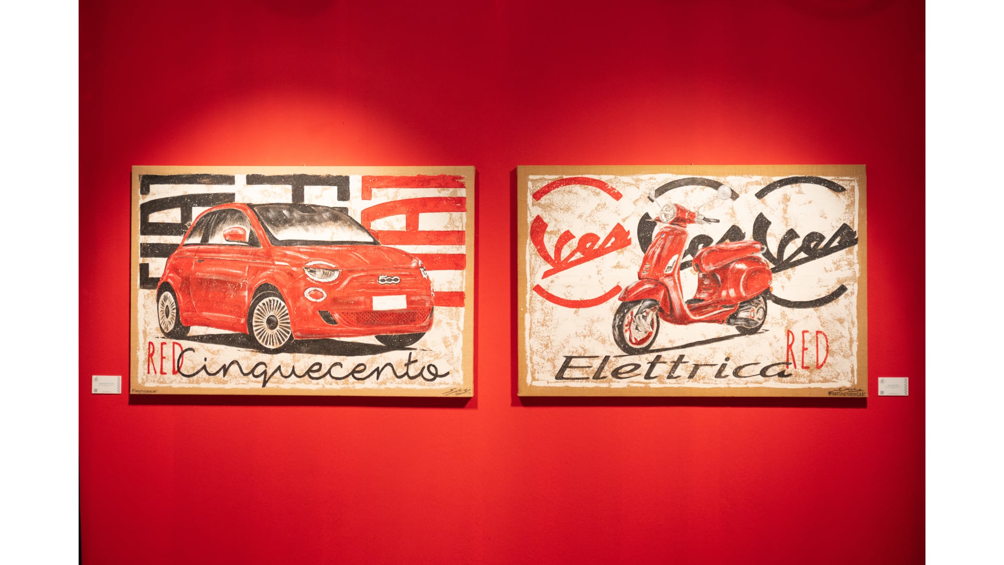 The paintings, all large in size, tell the story of Vespa in a true “parade”: from the elegant models of the fifties and sixties all the way to its more modern versions. All in the setting of a harmonic and engaging layout which is perfectly placed in the halls of the Piaggio Museum’s temporary exhibits, in the heart of the old Piaggio workshops, “in dialogue” with the unique models displayed in this true “temple” of the history of mobility and Italian style.