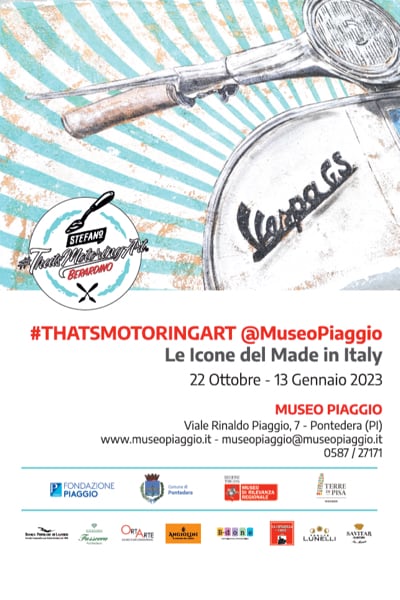 Piaggio Museum (Pontedera, Pisa province, Tuscany, Italy), 22 October 2022–13 January 2023 – Among the best tradition of craftsmanship and contemporary artistic inspiration, among canvases prepared by hand, palette knives, brushes, vivacious colours, and subjects which declare and express great unveiled passion: welcome to the world of Stefano Berardino, a young Italian artist from Piedmont in love with motors, who turns two and four wheelers into art subjects and “unique” protagonists of his painting production. His encounter is inevitable with the legendary Vespa (born in 1946), the timeless icon, protagonist for more than 75 years of Italy’s industrial heritage, undisputed symbol of style, technological progress, and Italian design all over the world, always capable of reinventing itself, attracting new generations.