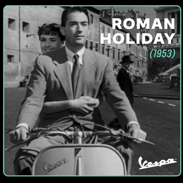 VESPA & CINEMA: AN ETERNAL LOVE. Appearing in more than 1,400 films, Vespa has always enjoyed a special relationship with cinema, which has played a major role in establishing this legendary brand. Its first screen appearance was in the 1950 Italian film Domenica d’agosto, but Vespa was to become an internationalstatus symbol in Roman Holiday (1953) by William Wyler through the famed sequence with Audrey Hepburn and Gregory Peck taking on the Roman traffic astride a Vespa 125.