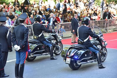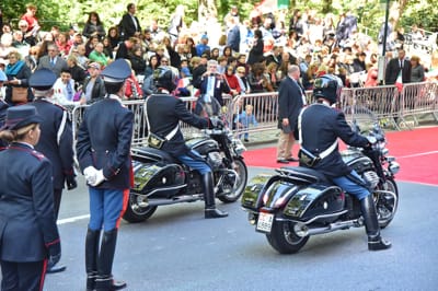 The corps, one of the most prestigious in the Italian Armed Forces, led the parade riding their sumptuous Moto Guzzi California 1400 bikes.