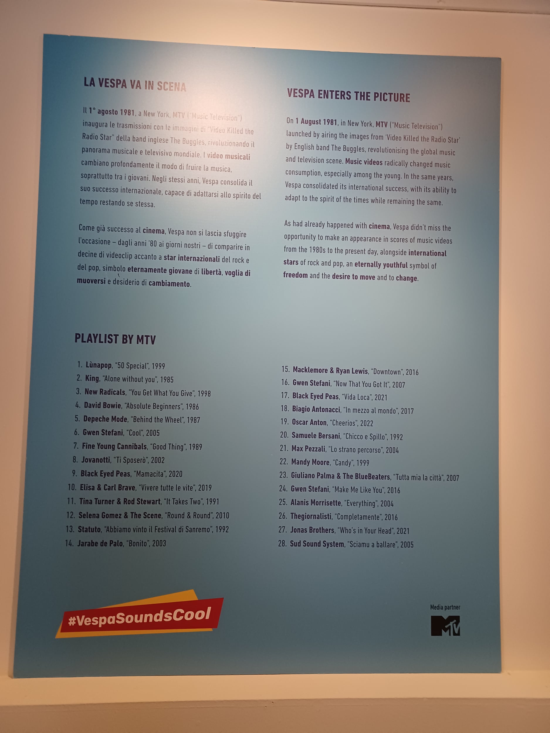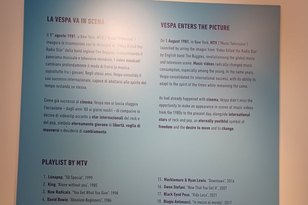 Thanks to extensive research and the invaluable contribution of our exceptional media partner MTV - Paramount's entertainment brand which is broadcast in Italy exclusively on Sky (channel 131 and streaming on NOW) - to the exhibition, visitors will be able to enjoy a wide selection of video clips in which Vespa stars alongside artists such as Lùnapop, Jovanotti, Elisa, David Bowie, Depeche Mode, Gwen Stefani and the Black Eyed Peas.