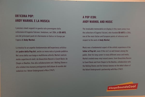 An exclusive selection of valuable objects with a musical theme from a private collection dedicated to Andy Warhol will take pride of place, accompanied by five historic Vespa models selected as being the most emblematic of the Italian brand's timeless relationship with music.