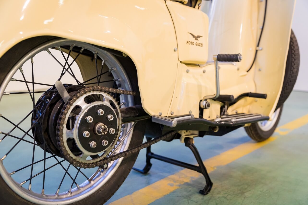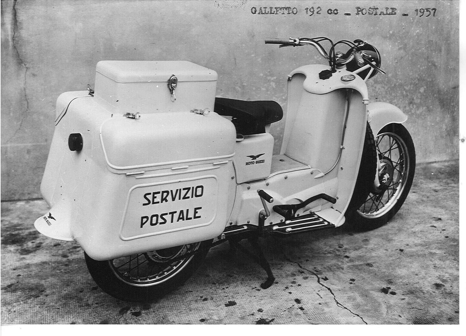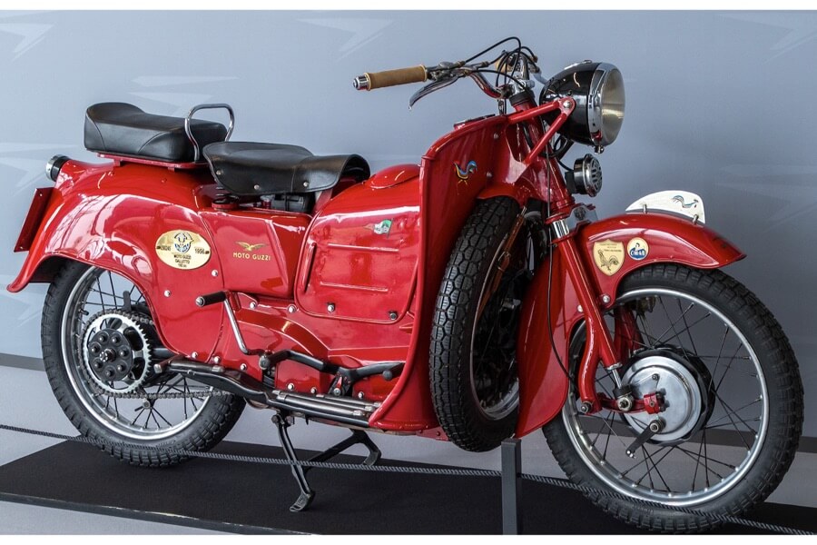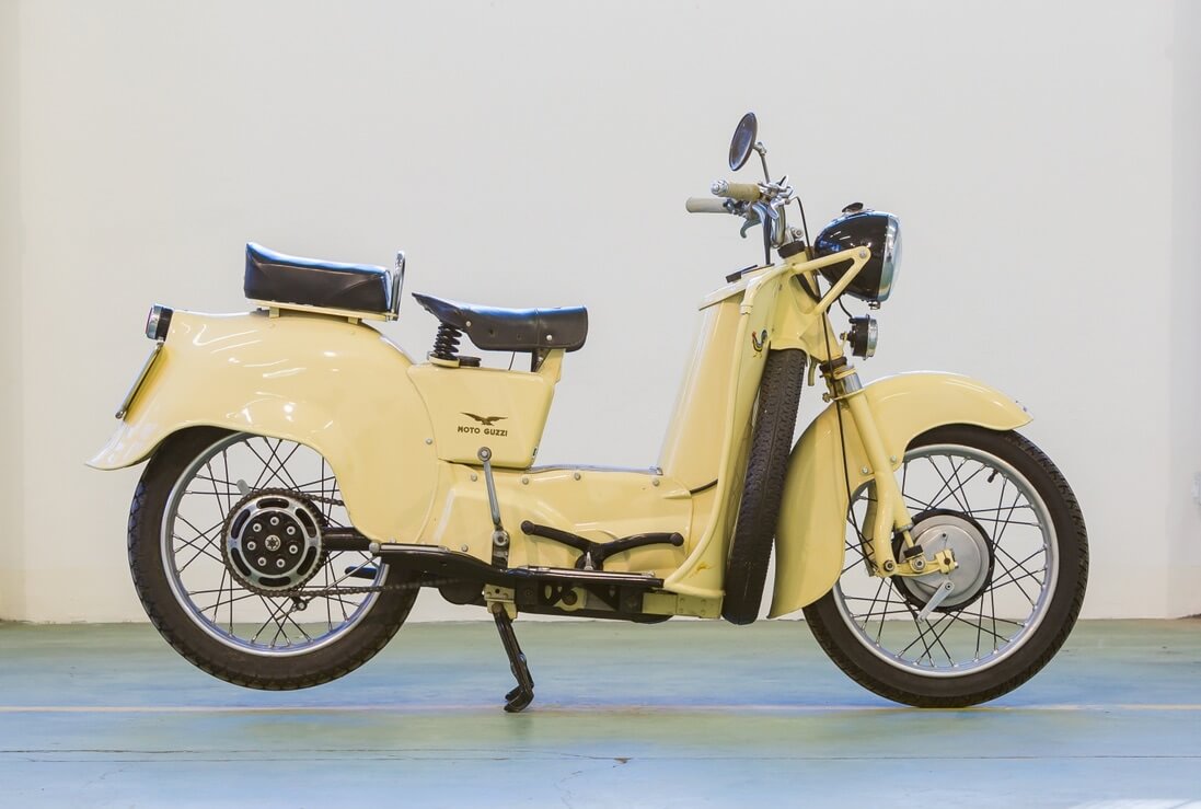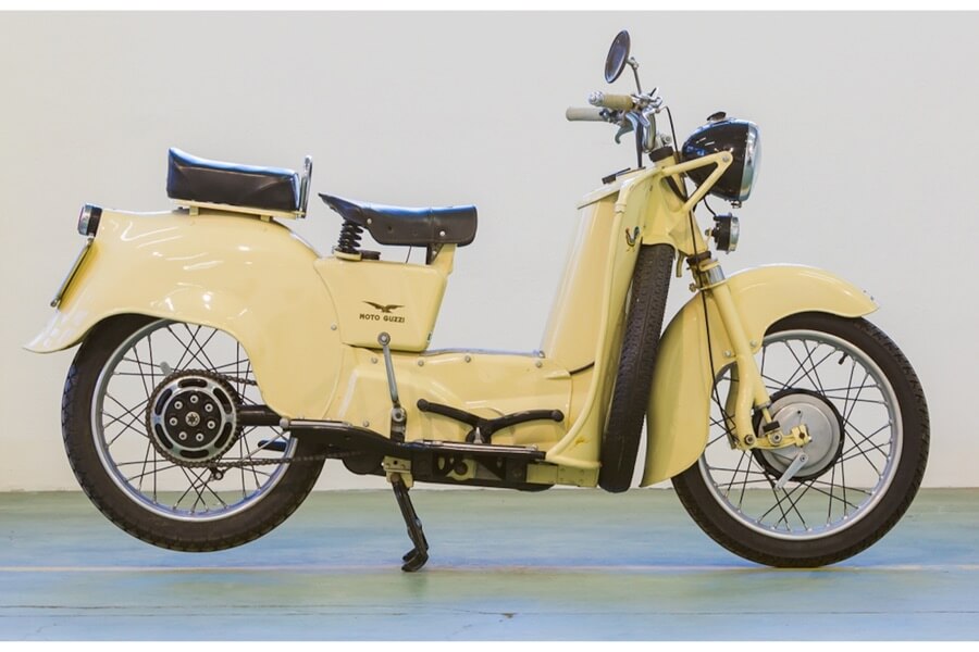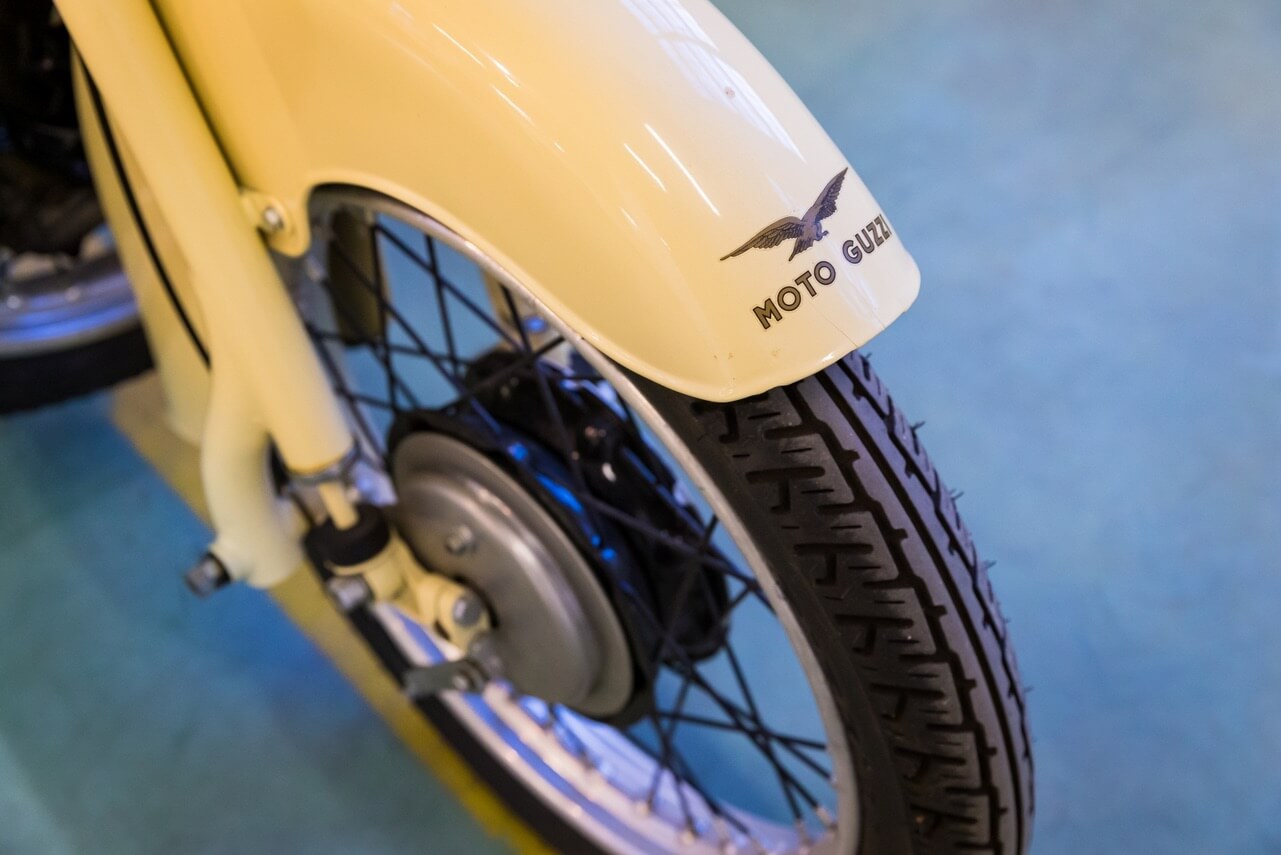 The bike was designed by Carlo Guzzi, who was at the helm of Moto Guzzi at the time: in collaboration with one of his employees, he came up with the idea to provide a spare wheel, positioning it transversely on the front of the scooter shield to offer effective protection in case of accidents.
