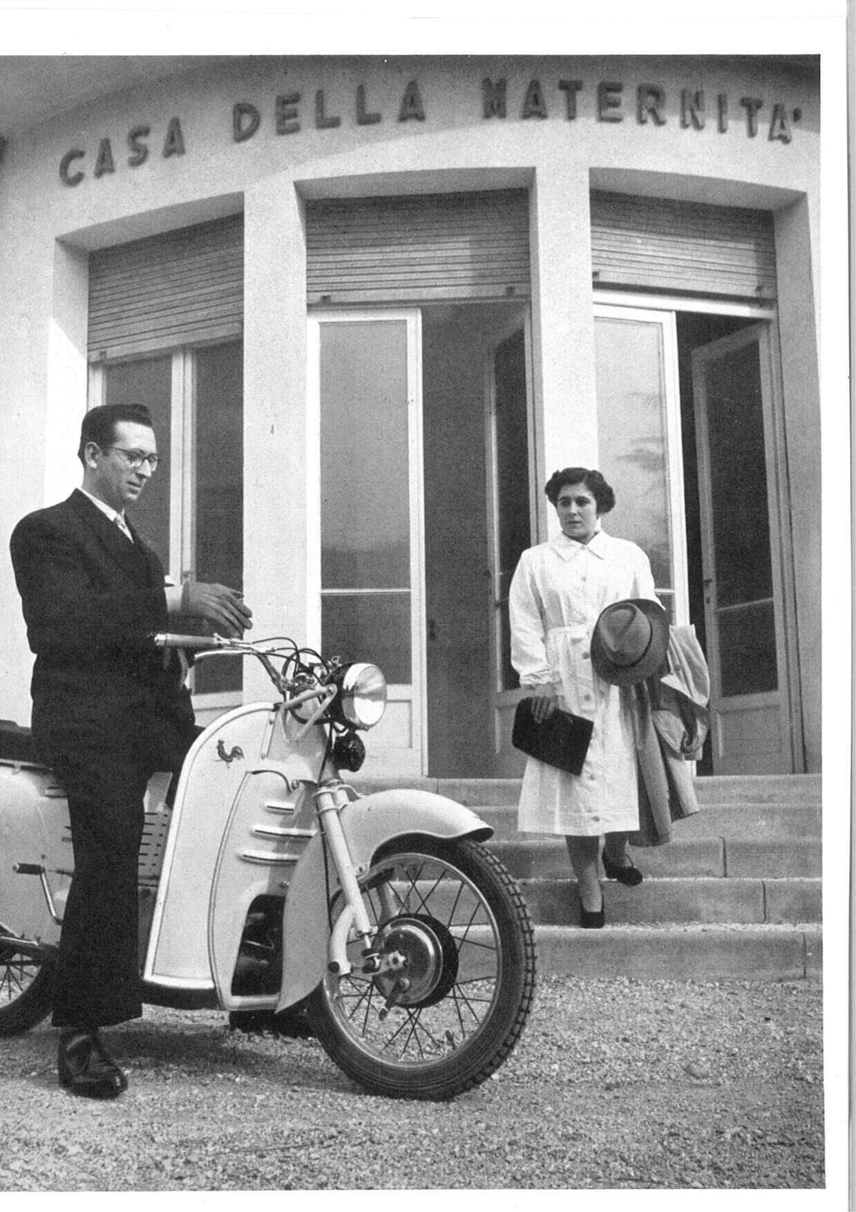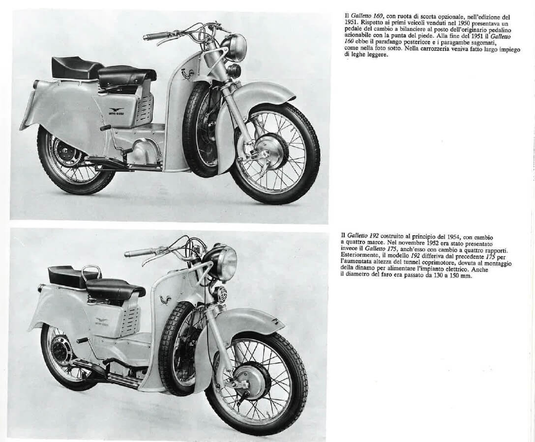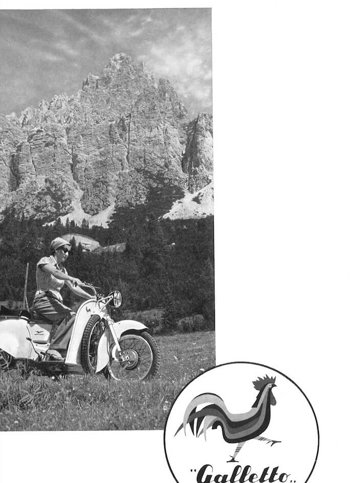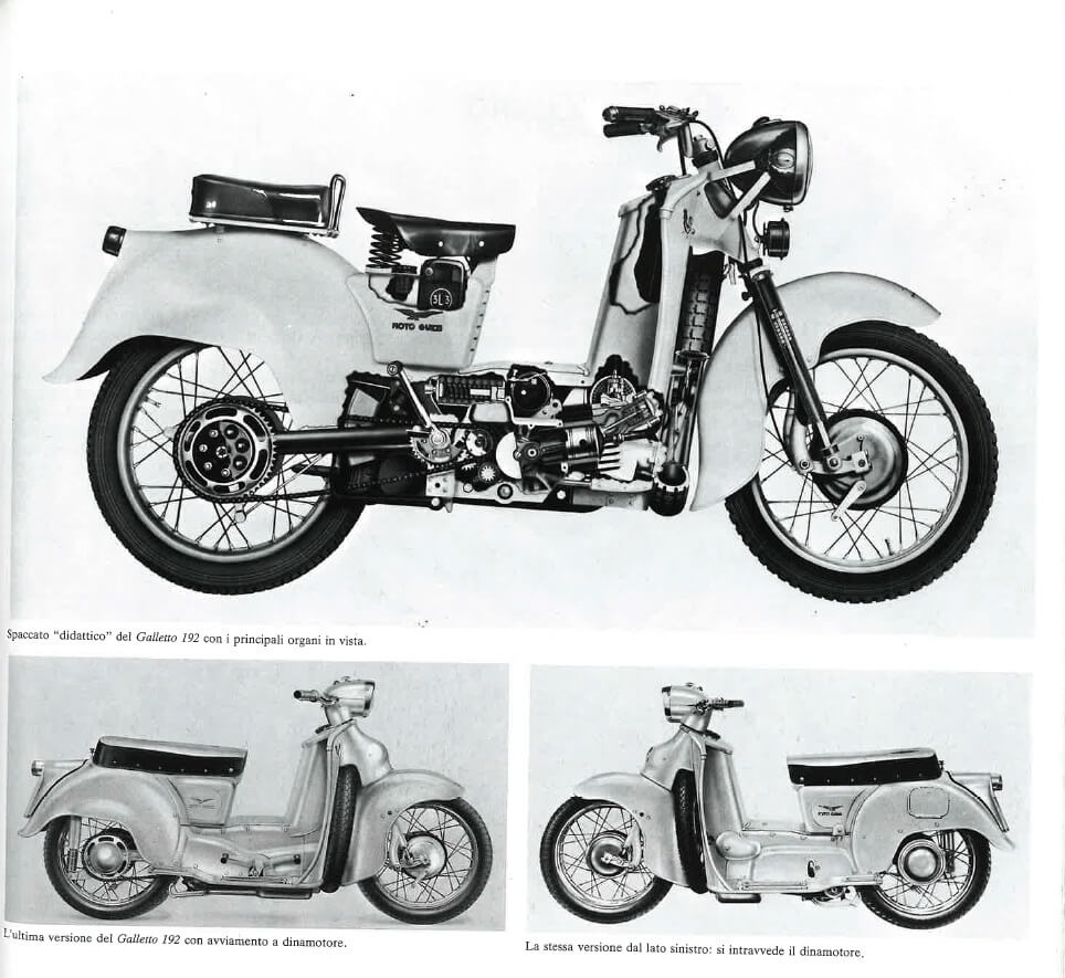 The Galletto is brilliant, original, unique: it represents the successful combination of the advantages of a scooter with those of a high-wheel motorbike, with none of their respective disadvantages. Indeed, this bike offers excellent protection for the rider and is easy to handle, with a spare wheel positioned at the front to form an effective bumper.