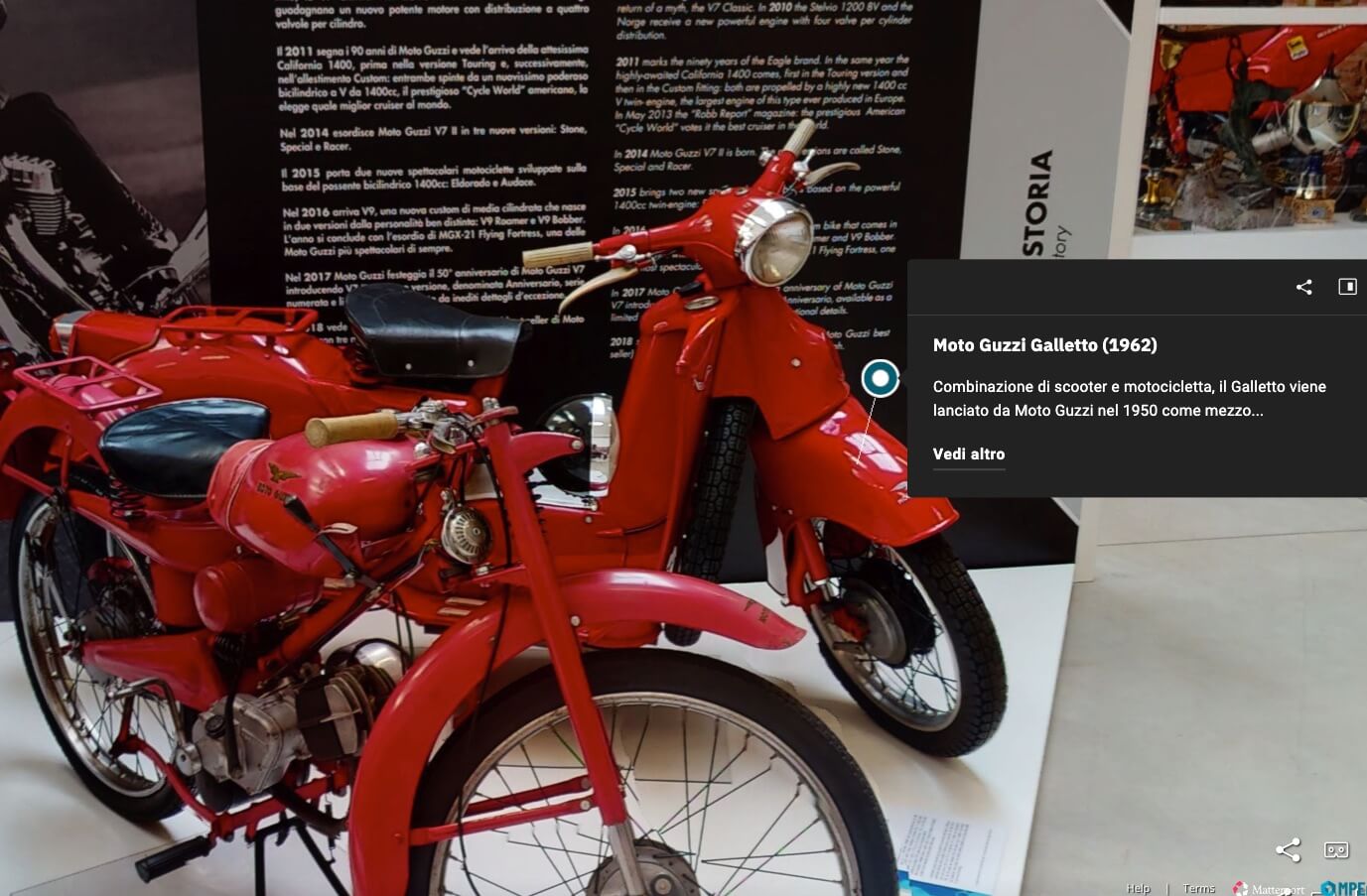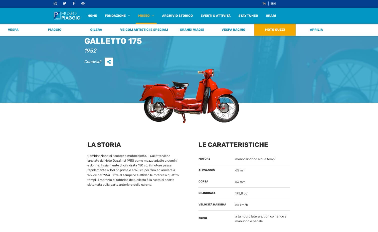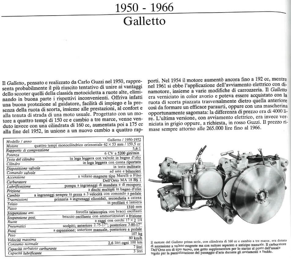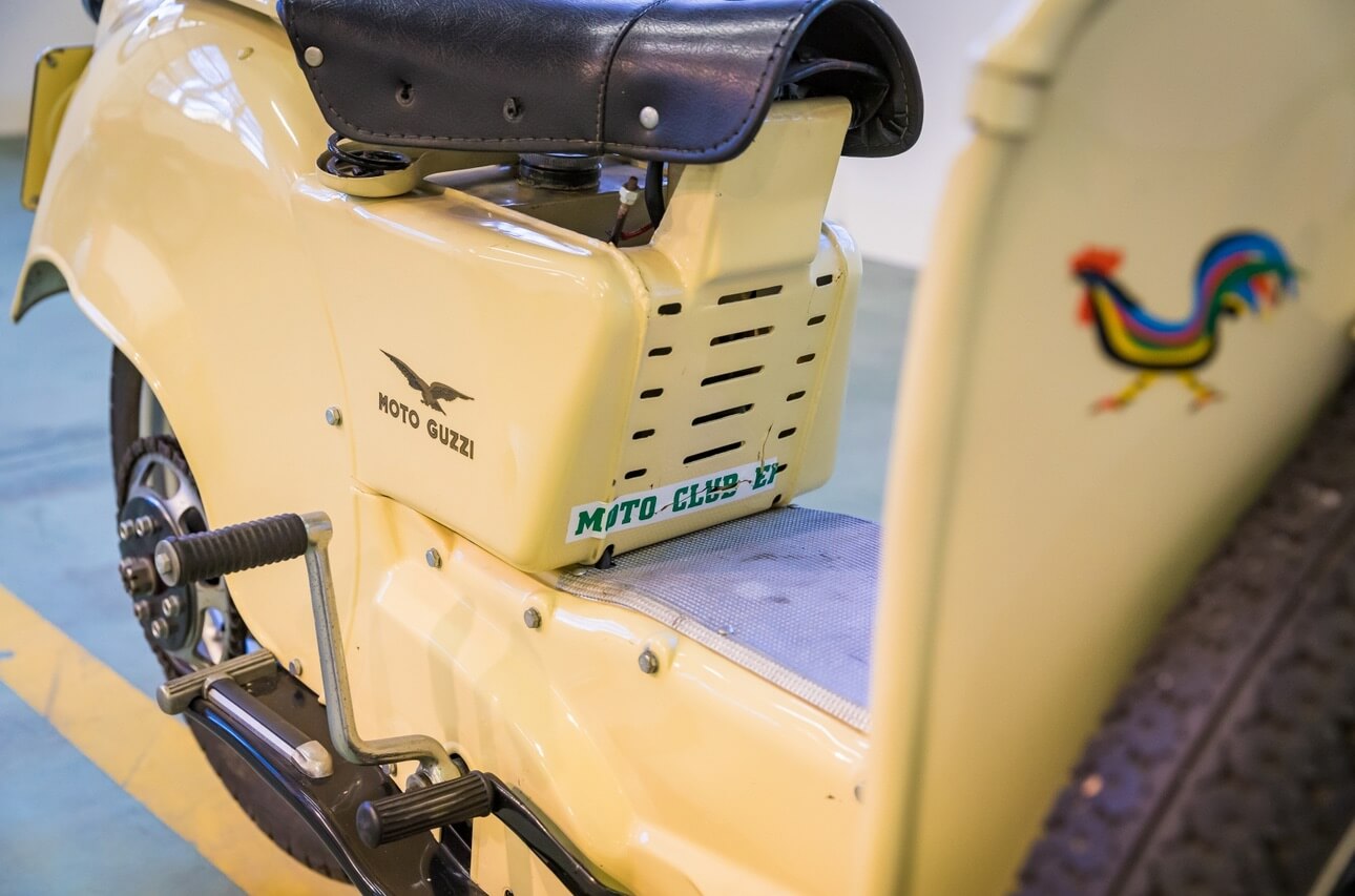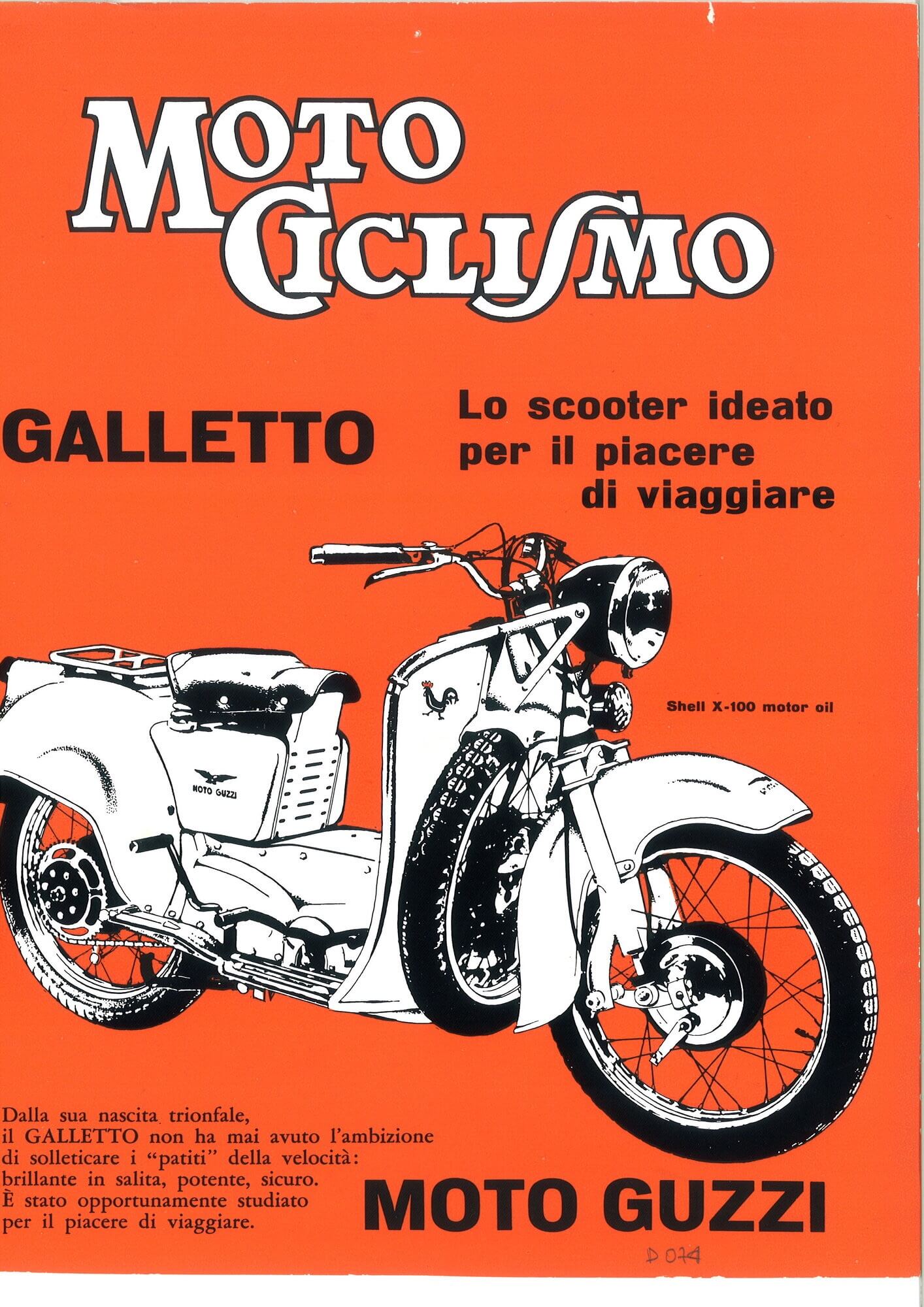 THE DISPLAY PANEL AT THE MOTO GUZZI MUSEUM IN MANDELLO. GALLETTO (1950-66). Better known as "the priest’s bike", the Galletto – half scooter and half motorcycle – seemed made to satisfy everyone when it made its début in 1954, due to the fact that it combined the practical advantages of both the scooter and the motorcycle to perfection. This high-wheeled bike features an open frame that makes it easy to get into the saddle, protective bodywork, a comfortable and relaxed riding position, a central structure to ensure optimal aerodynamics when cornering, a 4-stroke engine – considered the most reliable in its category at that time – and a spare wheel that made the rider feel more at ease, as punctures were a lot more common back then than they are today.