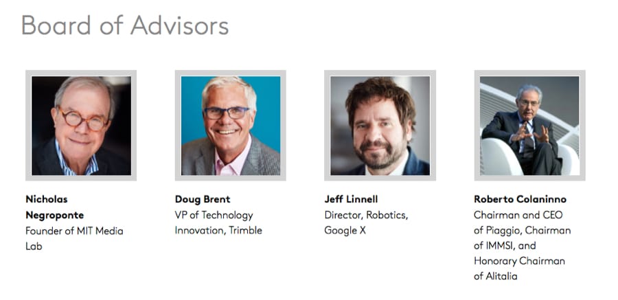 He joins an advisory board composed of primary excellences in the world of technology and robotics, like Nicholas Negroponte (co-founder of MIT Media Lab, professor of Media Technology at MIT), Jeff Linnell (founder of Bot & Dolly), and Doug Brent (CTO at Innovation di Trimble). Complete the board Roberto Colaninno (Chairman and CEO of the Piaggio Group).
