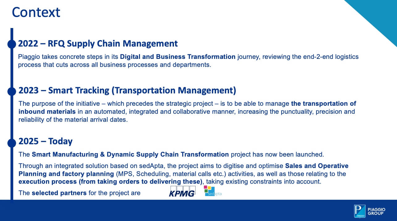 May 2025 (G.T.) – The “kick-off” of Gruppo Piaggio’s innovative, strategic project occurred on 4 April 2025. This date marked the launch of the “Smart Manufacturing & Dynamic Supply Chain Transformation” programme, which is set to have an impact across all areas of the company worldwide. It has the following key objectives: to renew the logistics process, increasing its flexibility, and to provide an increasingly effective response to markets and customers’ requirements. But in order to understand better, let's take a few steps back, with a summary of the measures taken in recent years in order to arrive at the start of this new project (see slide below).