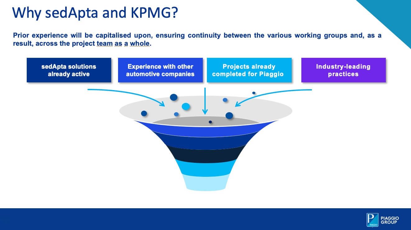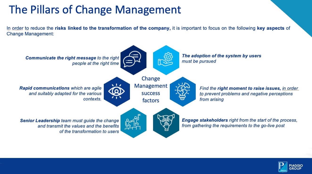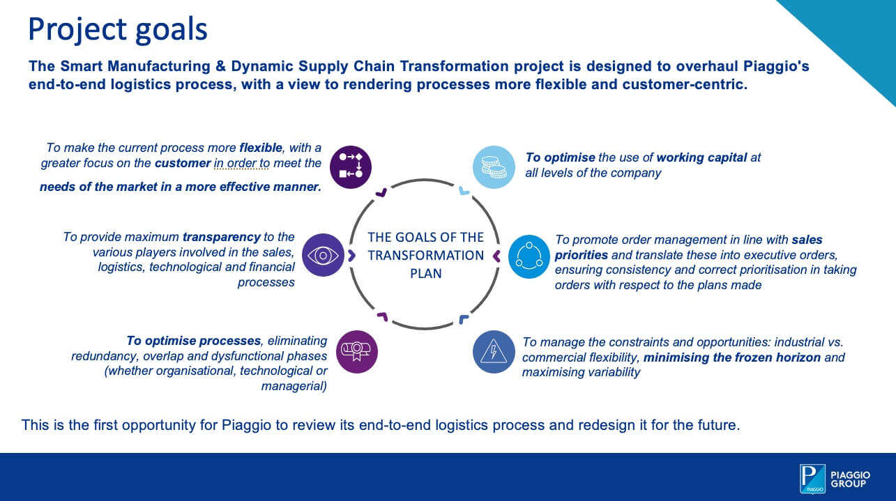 The goals of a high-value project designed to implement an ‘historic’ transformation. When undertaking corporate projects of this calibre (and complexity), investment, skill and above all entrepreneurial drive are essential, in order to bring about improvement (in terms of time, costs, customer satisfaction, etc.) as well as to ensure the courage to see them through. It is no small matter, and this is why, despite the fact that this is a highly specialist topic, we wish to share the process with our readers, courtesy of the support provided by Vittorio Boero, Chief Information Officer (CIO) Piaggio Group, who is leading the project.