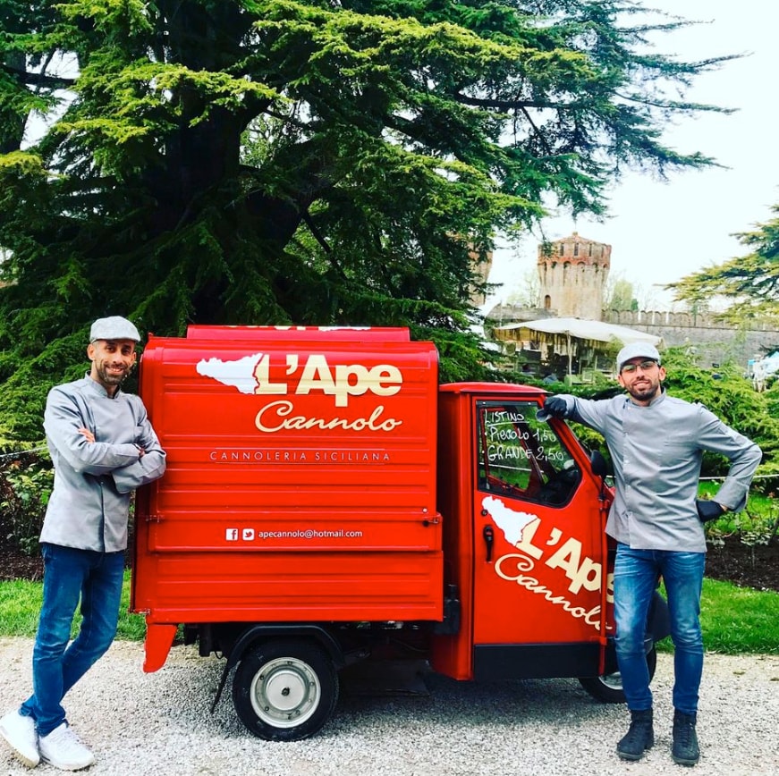 February 2021 – Two brothers, a simple and ingenious idea, and a delightful and tireless travel companion that is recognisable at a glance anywhere: these are the ingredients of the fortunate Ape Cannolo-Cannoleria Siciliana business, founded by Giovanni and Francesco Fecarotta who, since 2014, have been providing the pastry specialities of their native Sicily on the streets of Veneto (Northern Italy), specifically in Treviso and the surrounding areas, with the famous three-wheeled Ape, reaching about forty villages, mile after mile.