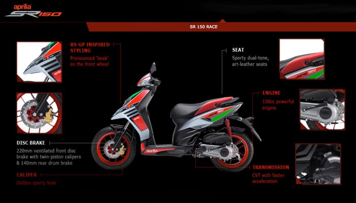 NEW APRILIA SR 150 RACE. To celebrate the success of the Aprilia SR 150, at the beginning of February 2017, the new Race version was launched, taking its inspiration from the Aprilia RS-GP motorbikes that compete in the MotoGP championship. Also produced in the Piaggio factory in Baramati, the new model is intended chiefly for young riders. With its strong sporty style and performance, with every detail based on a racing inspiration, it sets out to repeat the success of its predecessor.