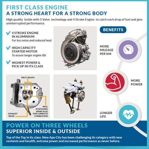 With smart new interiors and a new on-board instrument panel, the “Romanza” features a 200cc 4-stroke 4-gear petrol engine and can handle inclines of up to 22%; it offers low fuel consumption and maintenance costs, reliability and comfort for the driver and two passengers.