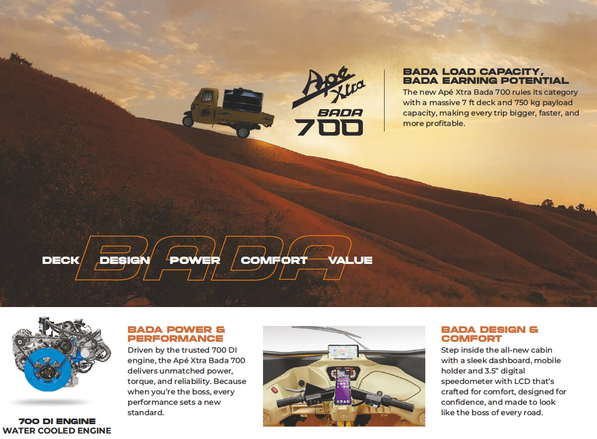 Piaggio India explains also that has positioned the Apé Xtra Bada 700 as a direct competitor to entry-level four-wheeler small commercial vehicles (SCVs), remarking that the deal as evidence that the three-wheeler segment can encroach on applications traditionally served by four-wheeled cargo vehicles.