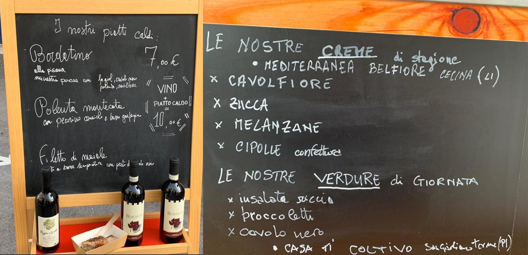 THE QUALITY OF TUSCAN FOOD. A broad selection of tempting specialities are offered, depending on seasonal availability. Examples include, beef tartare with creamed walnuts, ricotta from the Garfagnana, salad leaves and baby fennel, and Tuscan wholemeal bread; roast beef, cauliflower and caramelised onions; schiacciata filled with Tuscan salame, field greens and fresh caciotta cheese; sausage and pecorino cheese on creamed pumpkin with turnips cooked in wine and bay leaves: seasonal vegetable soups (cauliflower, pumpkin, aubergine) and ribollita; a roll with Tuscan oil, black cabbage, fresh pecorino cheese and creamed cauliflower; chickpea soup with porcini, walnuts and thyme; and much more, including fish dishes.
