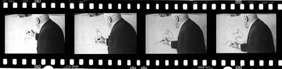 In the video’s English translation, Corradino d’Ascanio provides a running commentary on his drawing of the Vespa scooter: “I put a mudguard below the seat to cover the wheel…I aligned the steering column with the front wheel, automatically the scooter takes shape. Another new feature was to provide wheels that could be taken off, not in the same way as normal motorcycle wheels (which are mounted on a fork with a cross axle, so if you have a puncture you have pull out the axle, dismantle and remove the wheel). Whereas here the system is similar to that widely used on aeroplane undercarriages, where the wheels are cantilevered, so they can be taken off, as easily as on an automobile.”