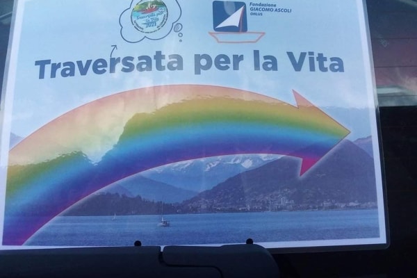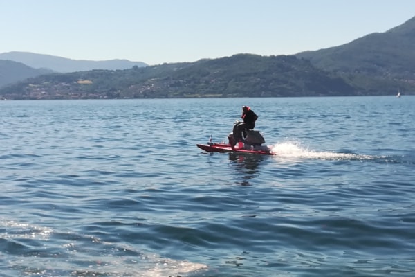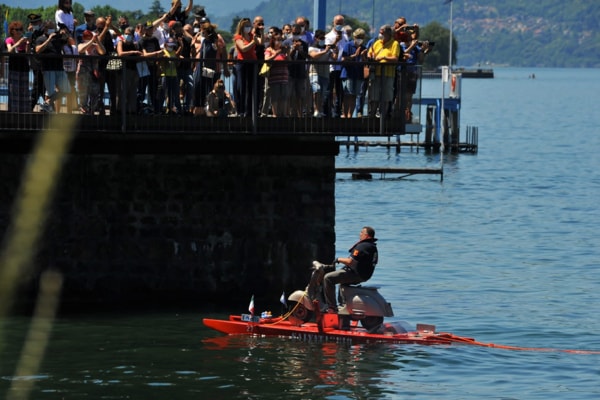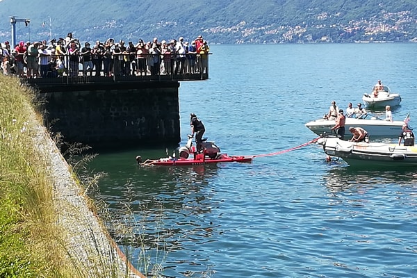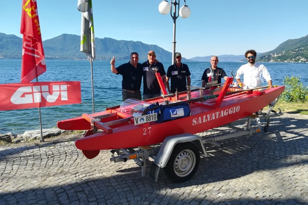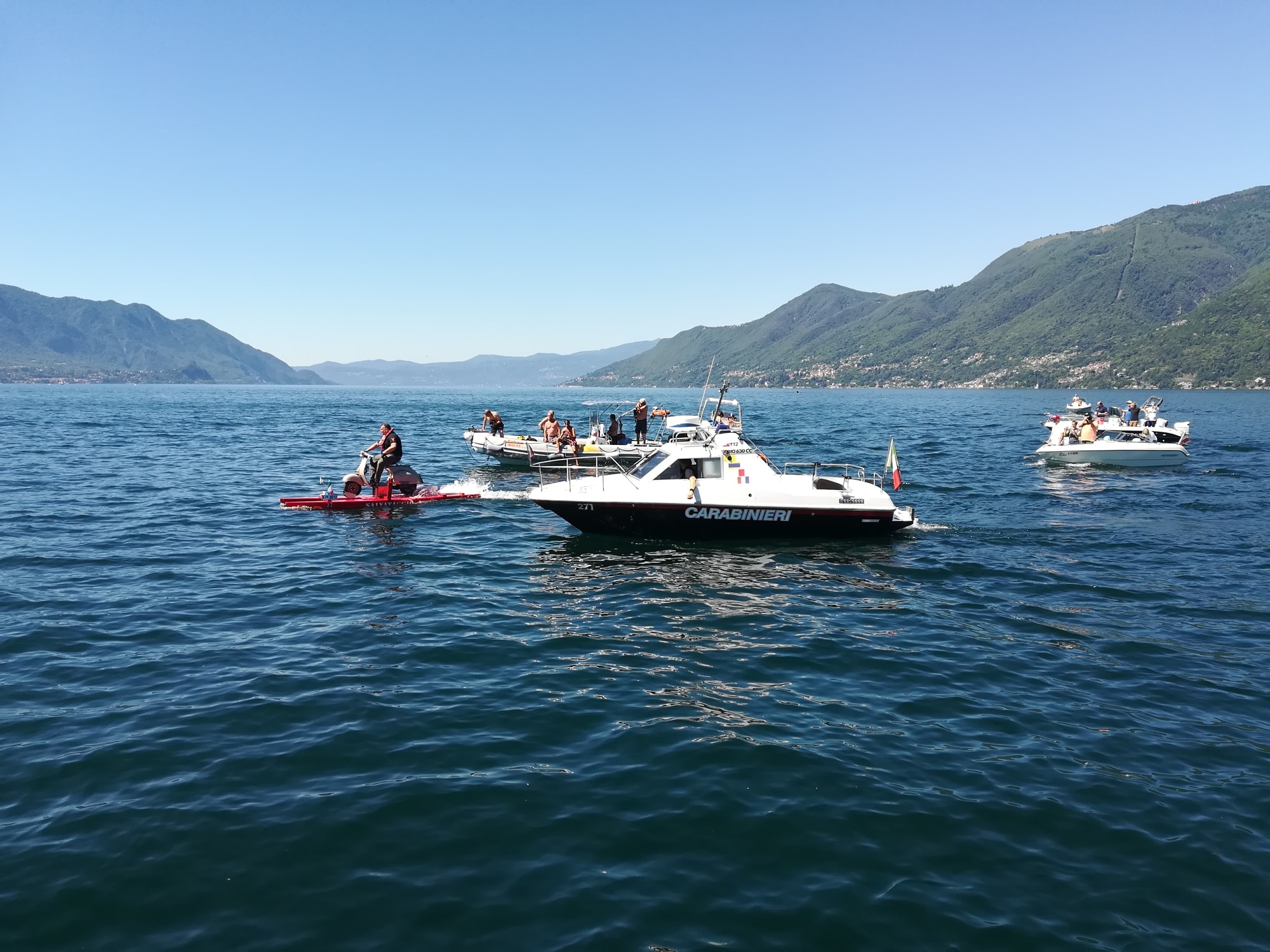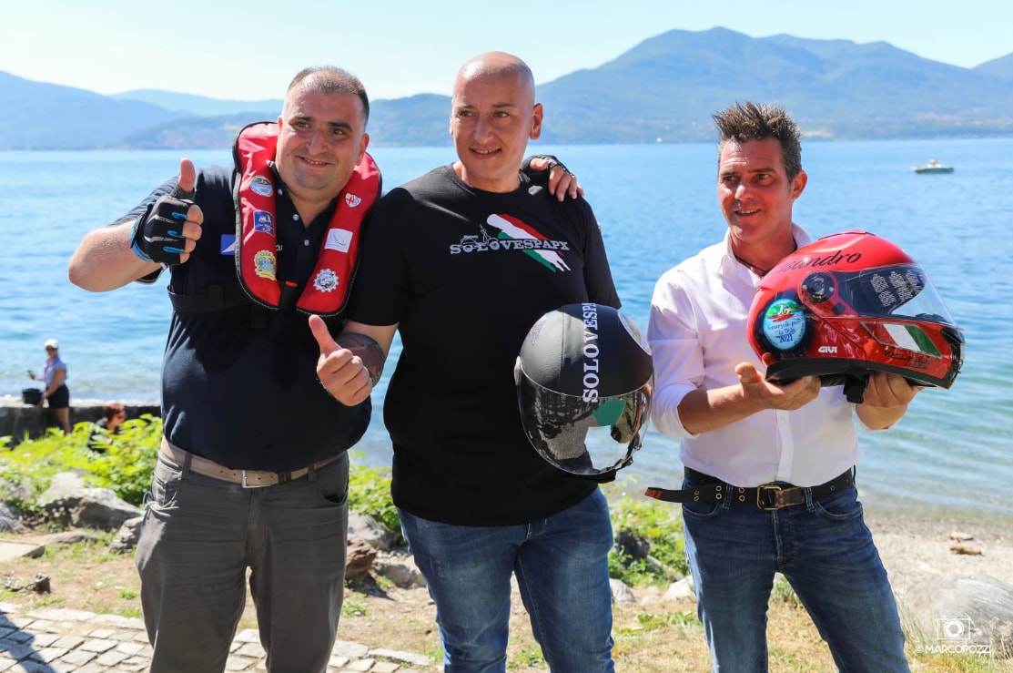 Great support from Vespisti: about a hundred of them left the Piedmont shore to reach Luino, going through Switzerland, Ascona, Locarno and then re-entering Italy, to wait for Pozzi to arrive in front of Palazzo Verbania. Safety was guaranteed by four supporting boats and a Carabinieri patrol boat, as well as a Guardia di Finanza helicopter.