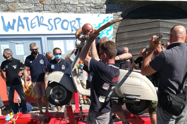 June 2021 – It is a well-known fact that Vespa inspire enterprises and helps the bold. One of the most original, successful challenges is definitely the “Traversata per la vita” [Translator’s note: Crossing for life], a charity initiative in favour of the Fondazione Giacomo Ascoli of Arese (Italy). The protagonist was Vespista Alessandro Pozzi and his vintage Vespa, specially outfitted to drive a propeller system, anchored to a rescue catamaran that crossed Lake Maggiore on Sunday, 13 June 2021, from Cannero Riviera, in Piedmont, all the way to the Luino bank in Lombardy. An unprecedented undertaking, over seven kilometres long and about two hours of sailing.