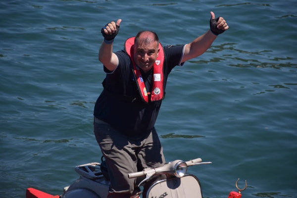 And he reminded us of the “historical” precedents: “The only crossings until now were done on the sea: the crossing of the English Channel by French rider Georges Monneret, October 1952, astride his ‘amphibious’ Vespa, and the one over the Strait of Messina done by Francesco Foti, July 2017, who recently passed away and to whom I dedicate this undertaking with my ‘Peraspera’, as I've called my sailing Vespa.”