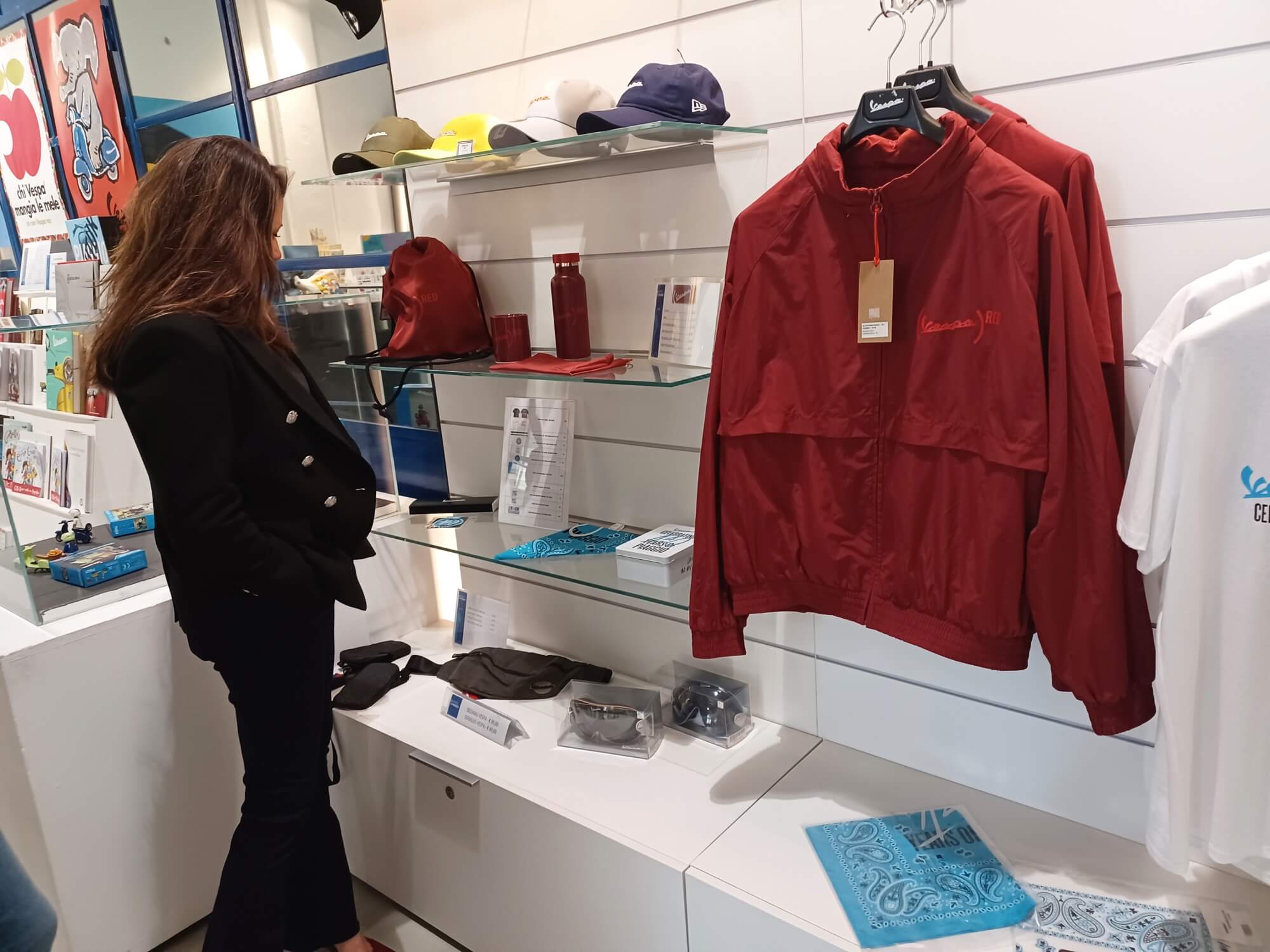 Piaggio Museum, Jennifer Lotito admire the Vespa (VESPA)RED products, on sale in the bookshop; impossible to resist the temptation…