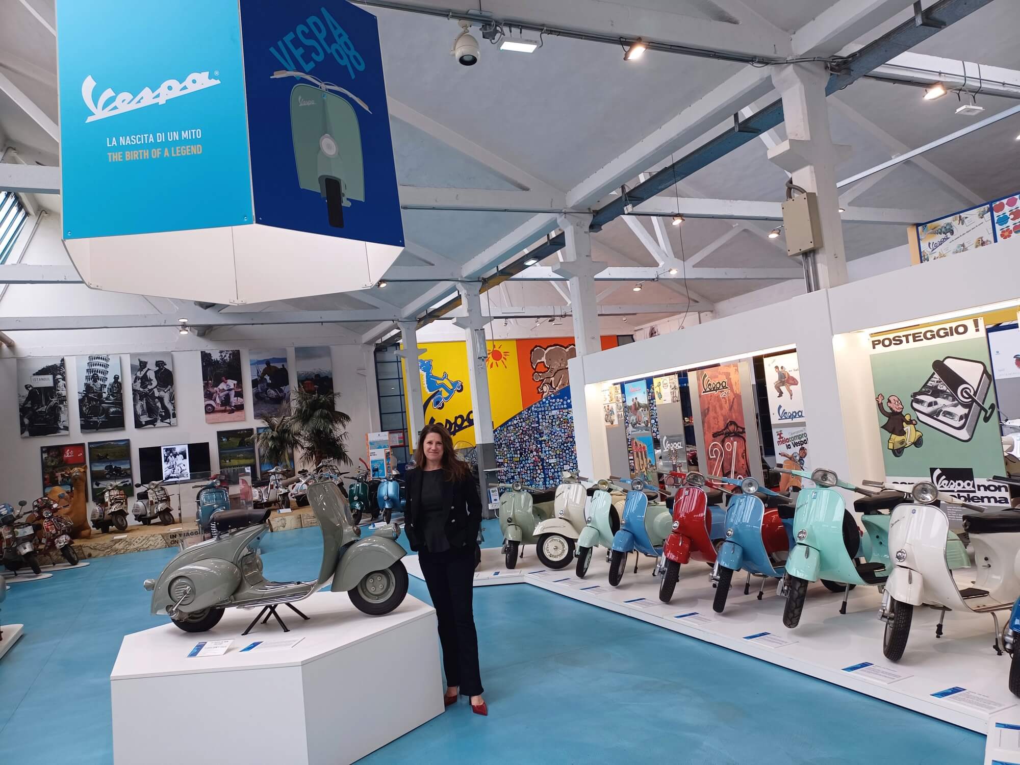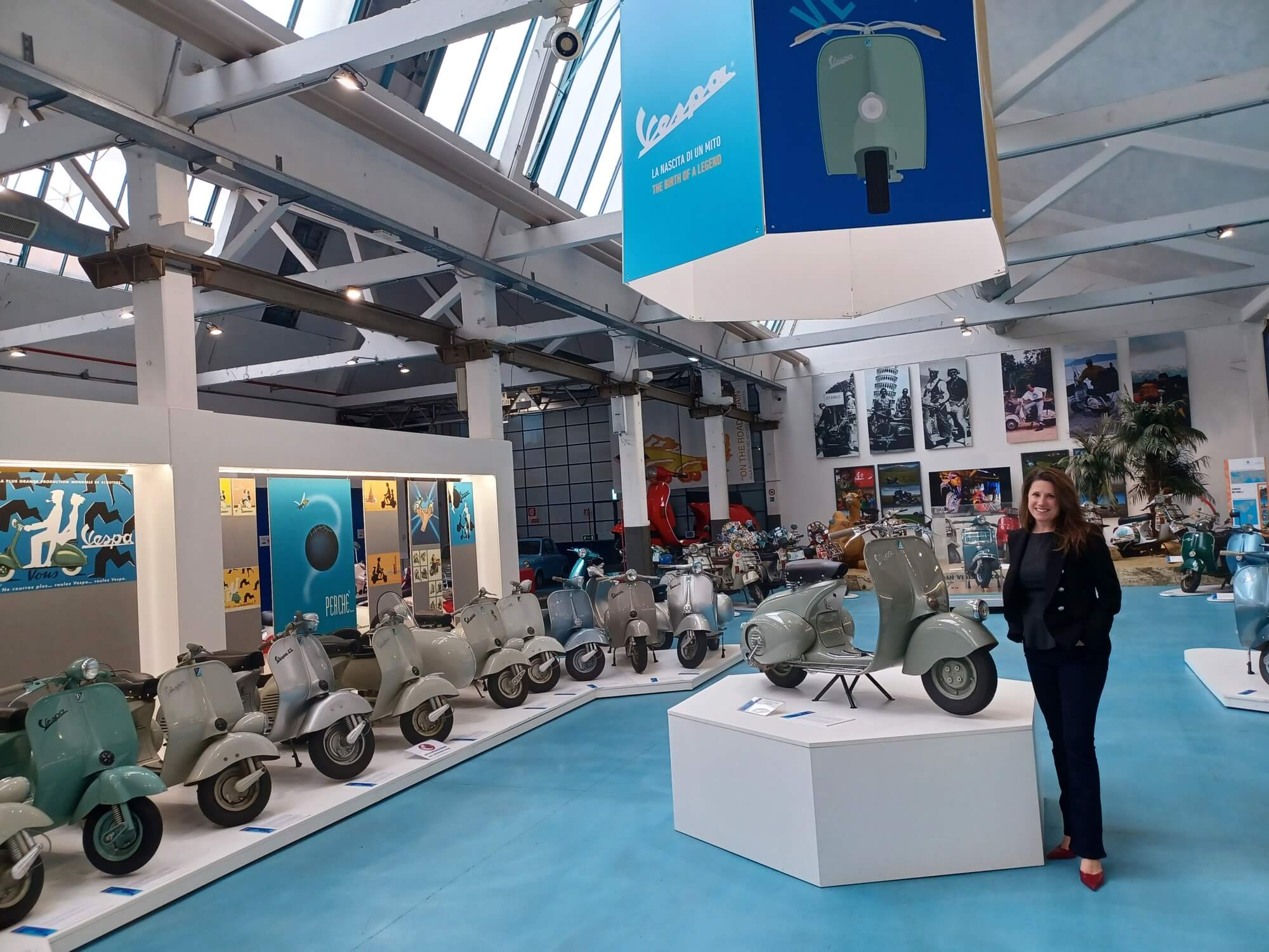 Jennifer Lotito at the Piaggio Museum, in the exhibition room dedicated to Vespa collection.