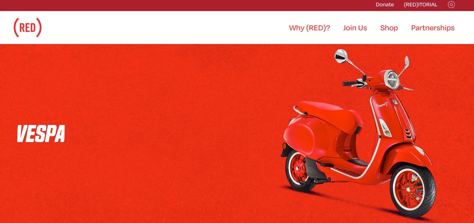 (RED) was founded in 2006 by Bono and Bobby Shriver to fight AIDS and the injustices that enable pandemics to thrive. We do this by partnering with the world’s greatest brands–like Piaggio–and people to raise money and awareness for global health crises.