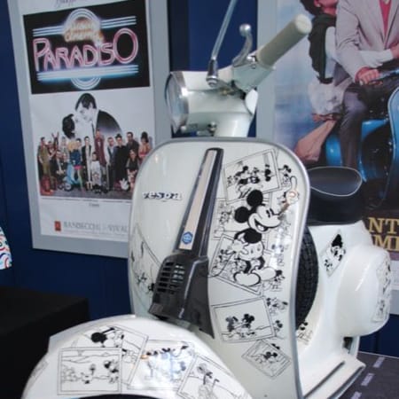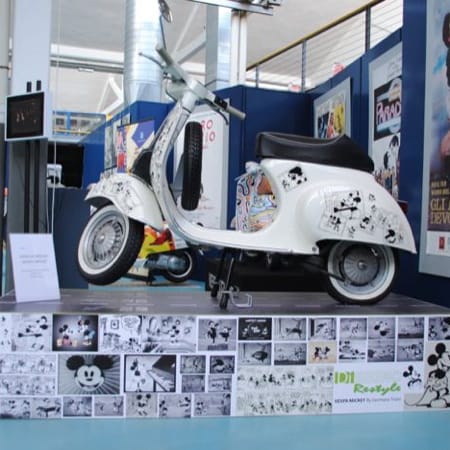 A white Vespa Special 50 decorated with Mickey Mouse comic strips. The scooter stand, another original piece, is also covered with cartoons. Disegno Restyle by Germana Triani.