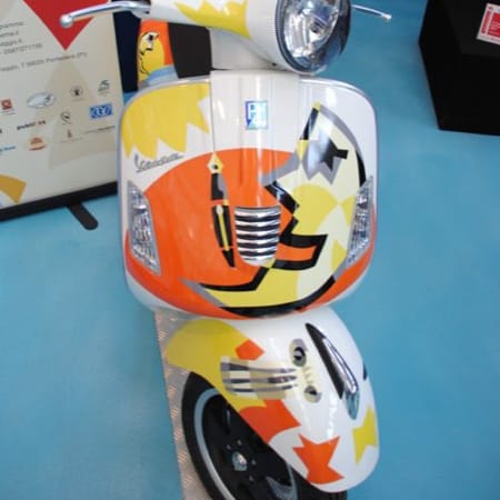 Moretto’s eclectic work draws admiring observers, standing next to other “artistic gems” like the Vespa signed by Salvator Dalì and the two-wheeler decorated by Ugo Nespolo, or Mino Trafeli’s remarkable Vespa. Now, they are joined by the contemporary style, powerful colours and musicality of the work of a dreamer and highly imaginative artist. The scooter, a Vespa 50 N from 1967, has undergone a Pop inspired makeover executed with flair, the result of personal research into materials and lively colours.