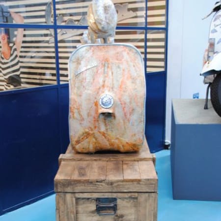 This is a creation by Gianni Depaoli (2012): a Vespa body covered with fish skin. The piece is part of the Organic Trash Art project, which uses organic waste to create objects intended to raise awareness about eco-sustainability and biodiversity.
