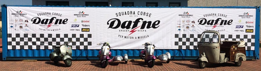 The vehicles ready for Speed Week 2016: the two Vespa sidecars for the race, more the 125 from 1951 and the Ape Calessin ( vintage model) for riding around the paddock