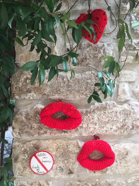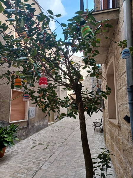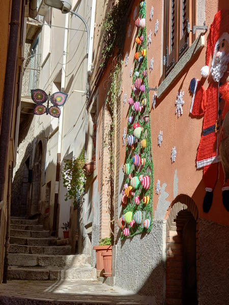 Flowers hanging from branches, lamp covers on public lighting, decorations on the doors of homes: these are the crocheting creations that enhance the historic centre of Oratino (Campobasso, Molise region, Italy), one of the “Most Beautiful Villages of Italy”. There is also “kiss alley”, where “not kissing!” is prohibited.